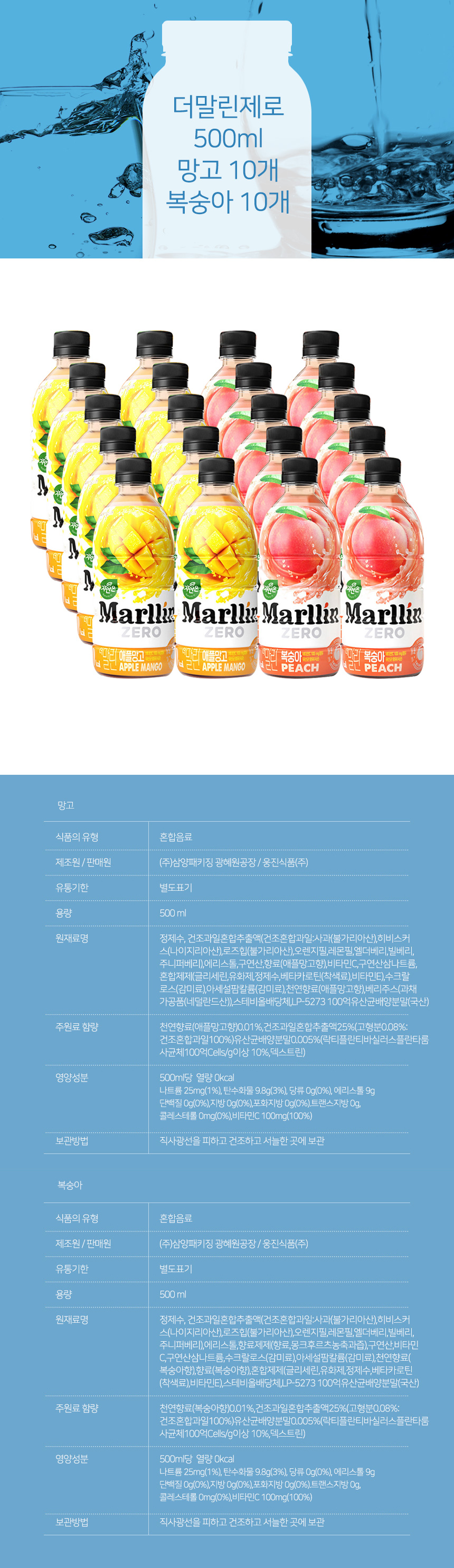 웅진 자연은 더말린제로 500ml 망고 + 복숭아 혼합 20입