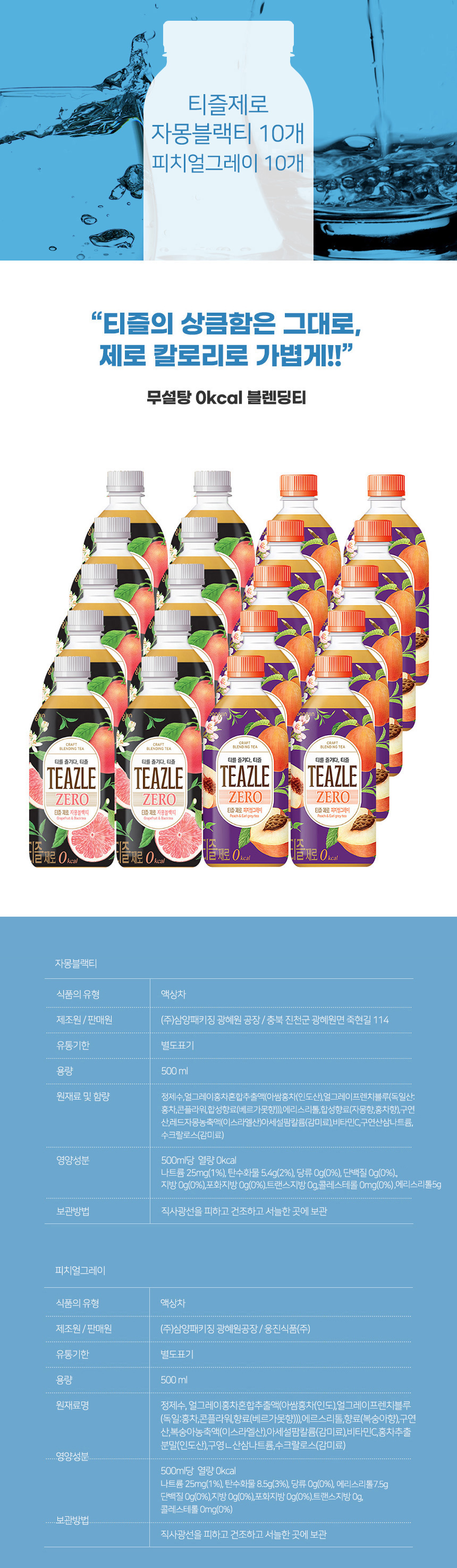 웅진 티즐제로 500ml 자몽블랙티 + 피치얼그레이 혼합 20개