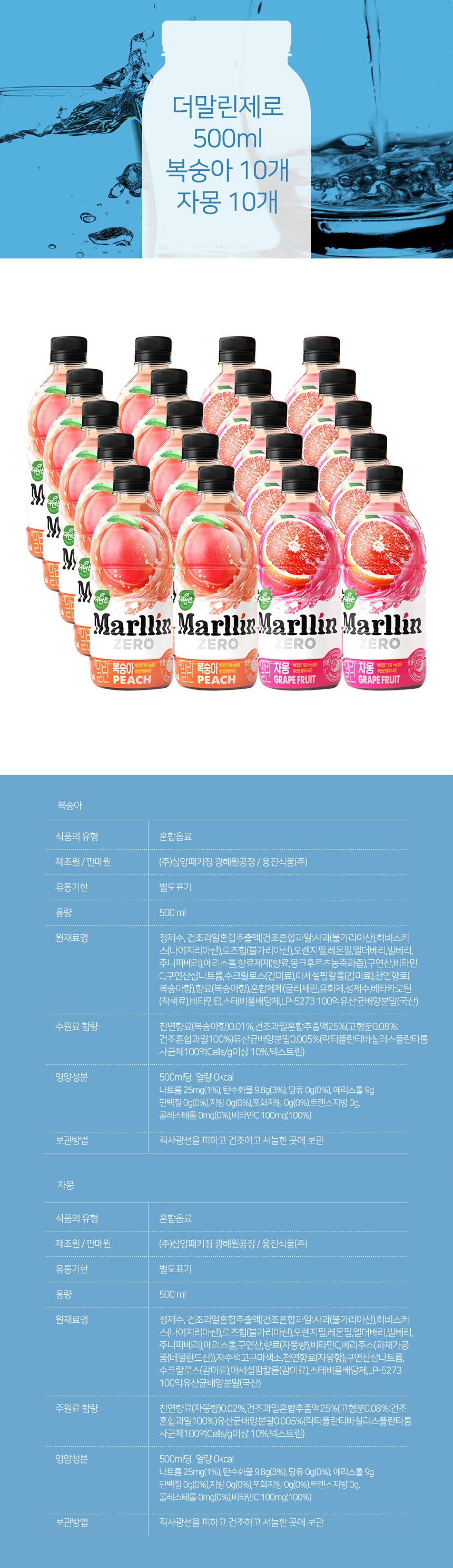 웅진 자연은 더말린제로 500ml 복숭아 + 자몽 혼합 20입