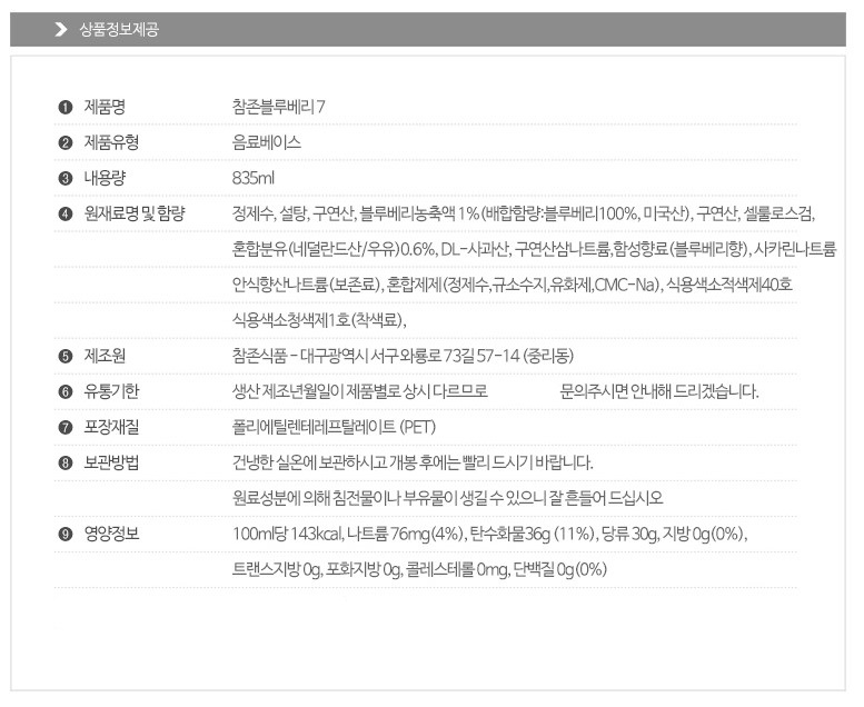 참존 블루베리7 원액 음료베이스 PET 835ml