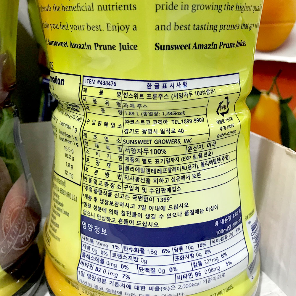 제품명: 썬스위트 프룬주스(서양자두 100%함유)유형: 과채주스소비기한: 제품의 별도 표기일까지용량: 1.89L제조사: SUNSWEET GROWERS, INC원산지: 미국