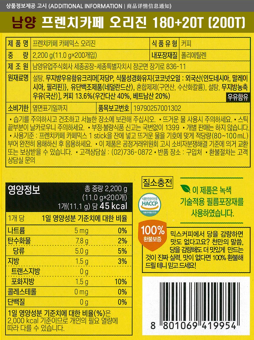 프렌치카페믹스 180T+20T 2개/진한커피맛 오리진커피믹스/총 400개