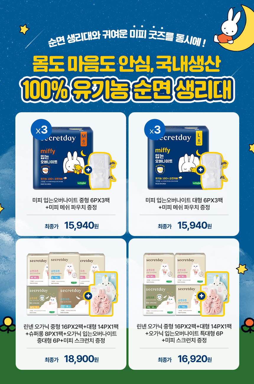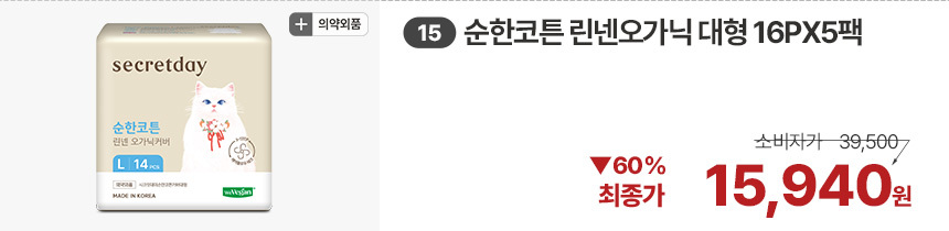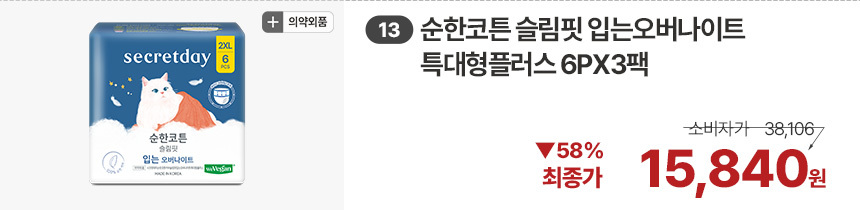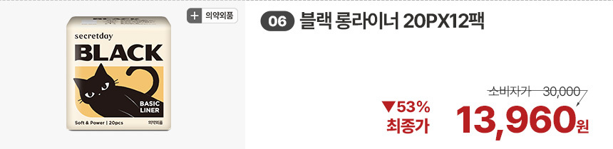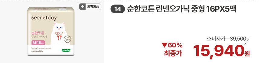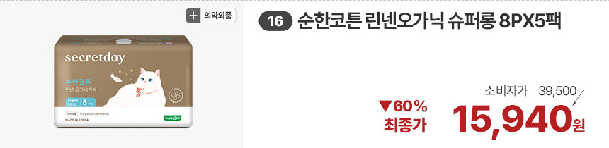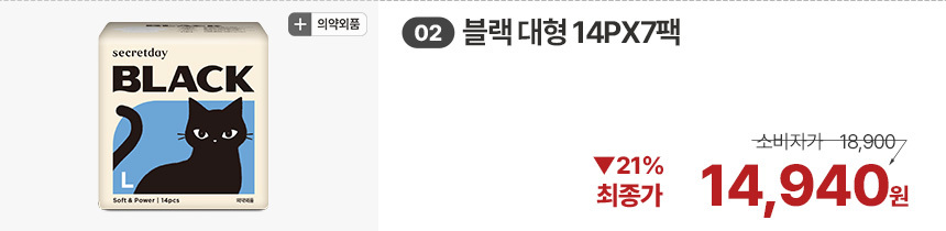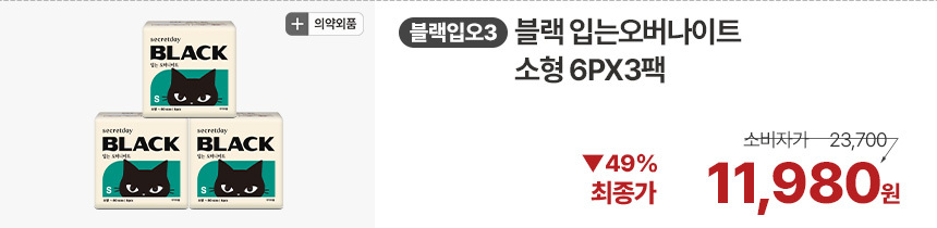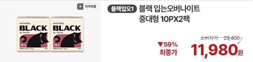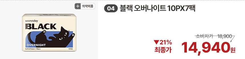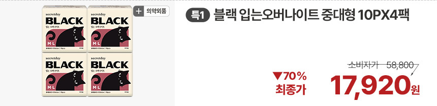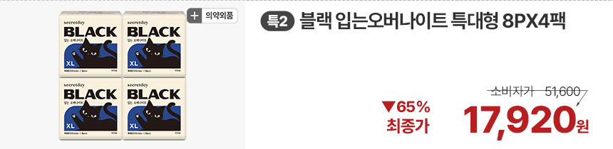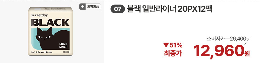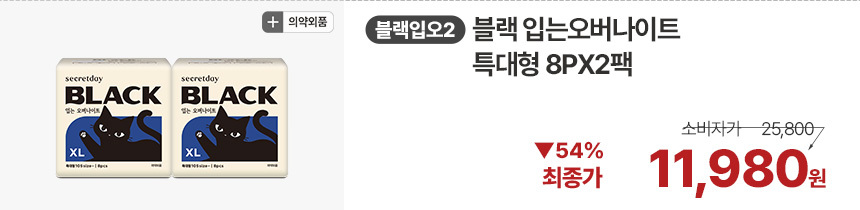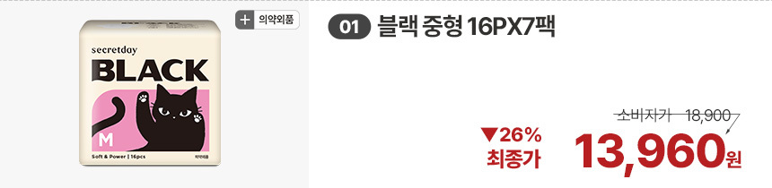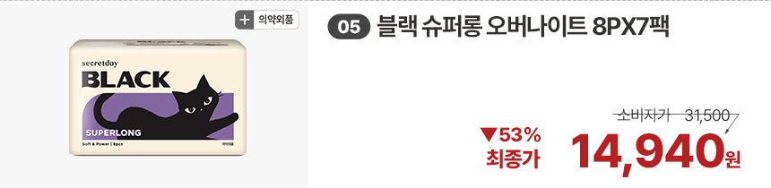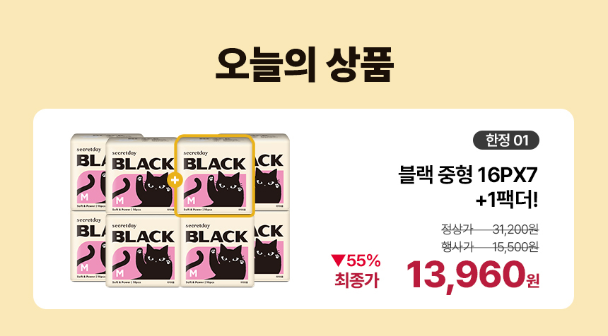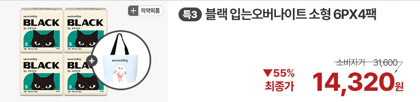 (한정/입오버 장당 400원대) 시크릿데이 생리대 블랙 중형 16PX7+1팩더 외 순한코튼/유기농
