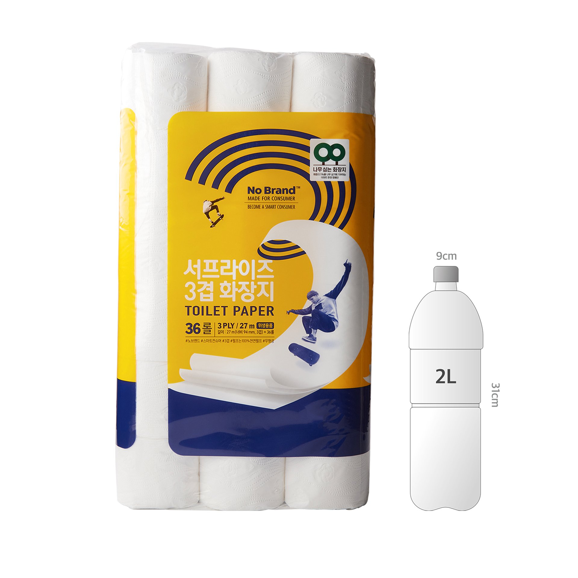 우리 집 화장실에 걸어두는 노브랜드 서프라이즈 3겹 화장지입니다. 100% 천연펄프로 만들었으며, 무형광이라서 안심하고 사용하실 수 있어요. 3겹으로 도톰해서 찢어지거나 밀릴 걱정 없이 편안하게 사용할 수 있답니다. 게다가 넉넉하게 36롤이나 담겨있어 오래 쓰실 수 있을 거예요. 직접 피부에 닿는 화장지, 이제 부드러운 3겹 화장지로 바꿔보세요.