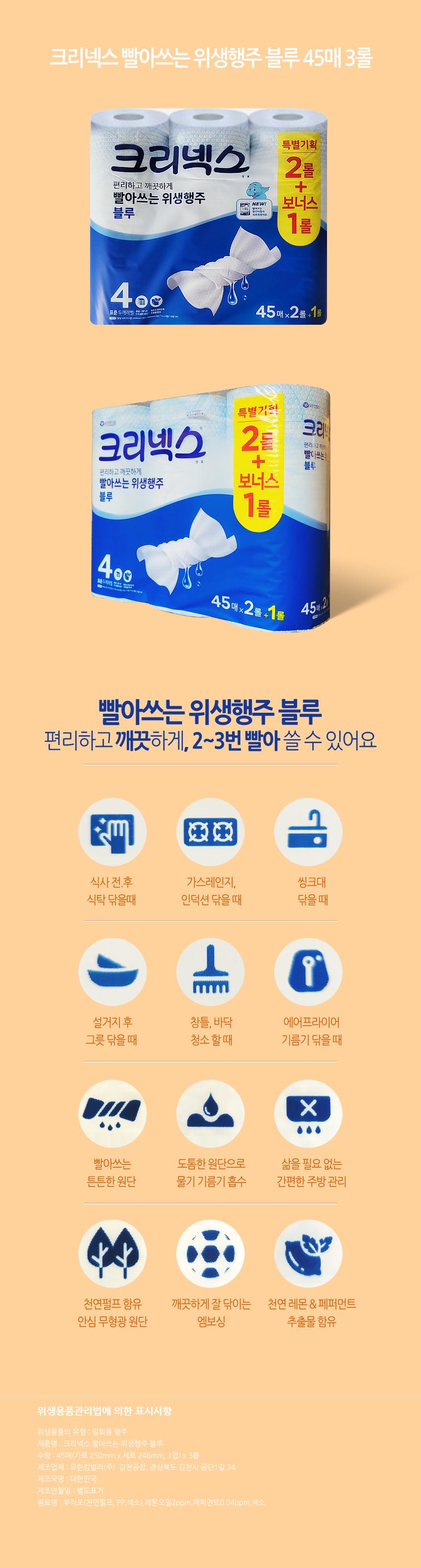 유한킴벌리 빨아쓰는행주 크리넥스 키친타올 블루 45매 3롤x2 키친타월 주방티슈