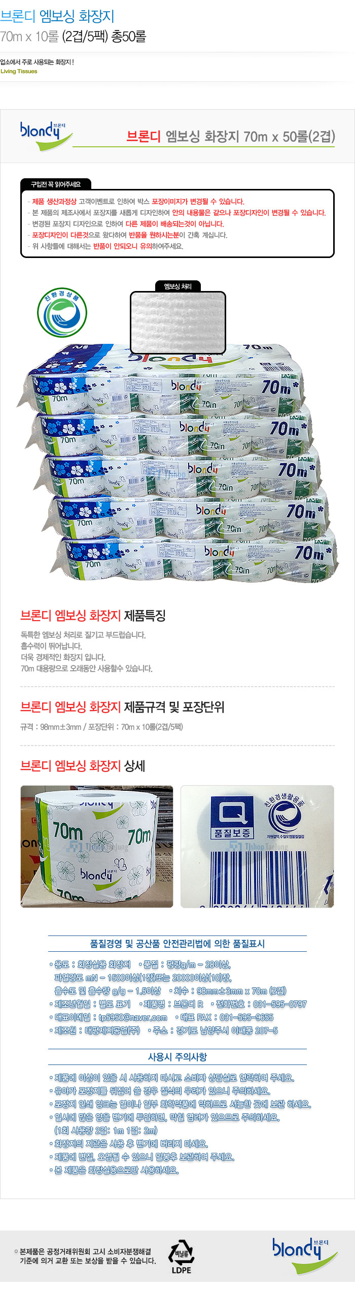 브론디 엠보싱 화장지 70m x 10롤 (2겹/5팩) 총50롤