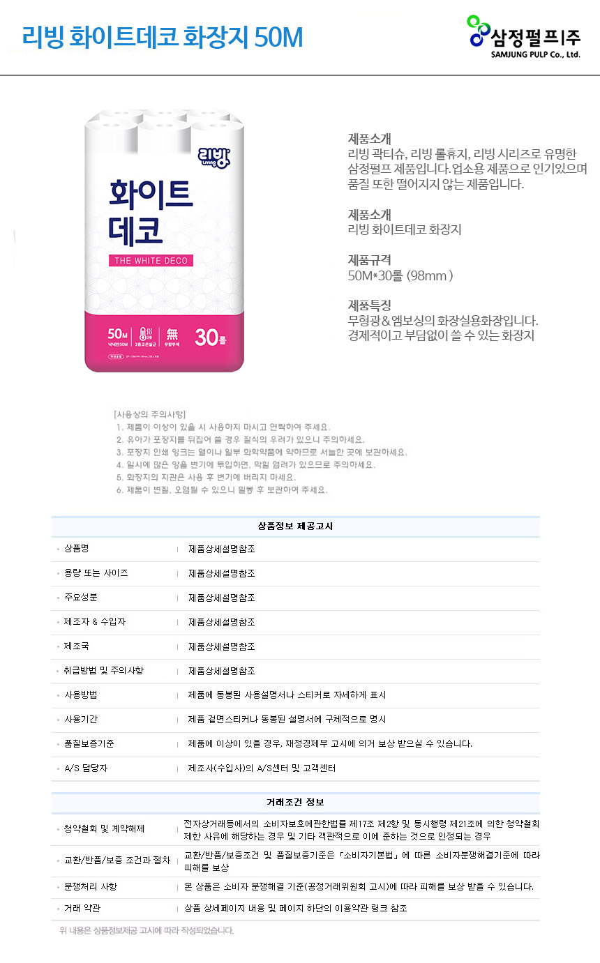 삼정 2겹 리빙 화이트 데코 화장지 50m 30롤 3팩