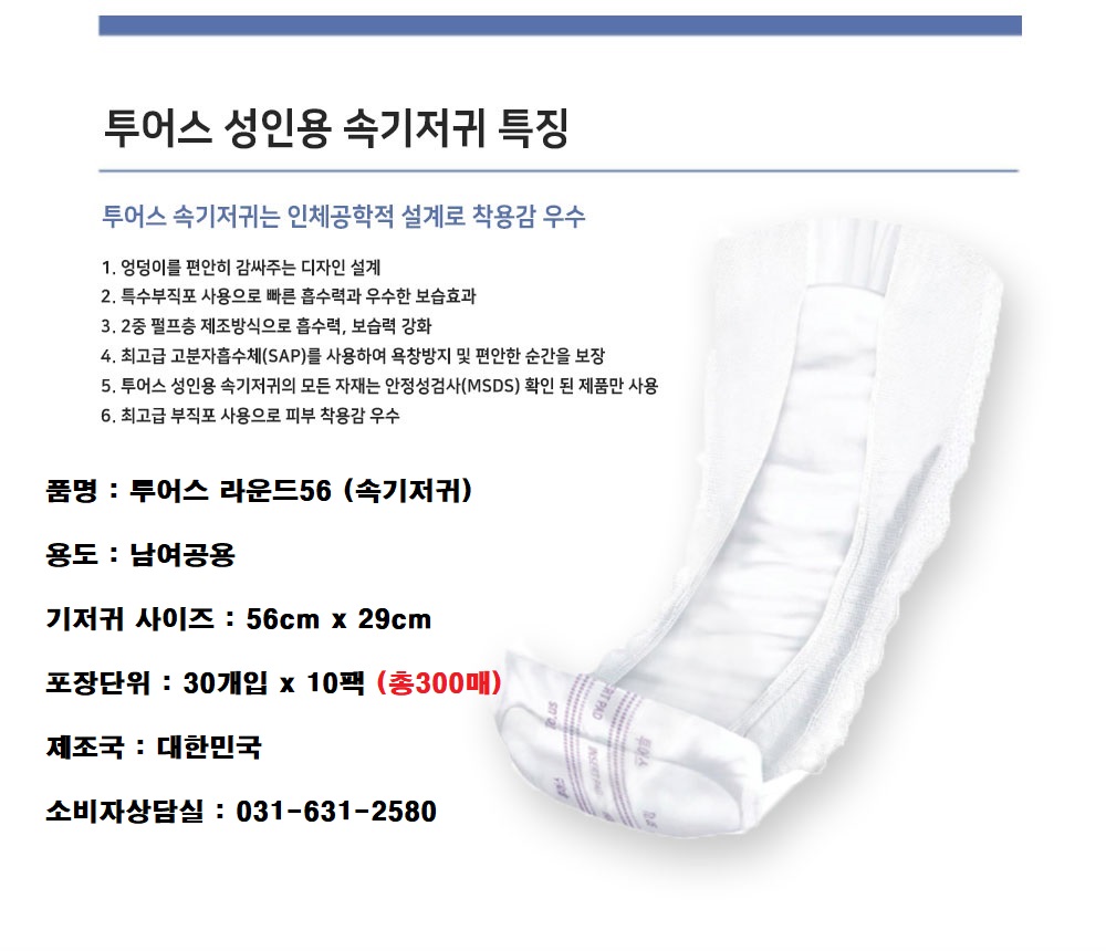 투어스 라운드형56 한박스 (300매)/ 성인용 속기저귀 (국내산)