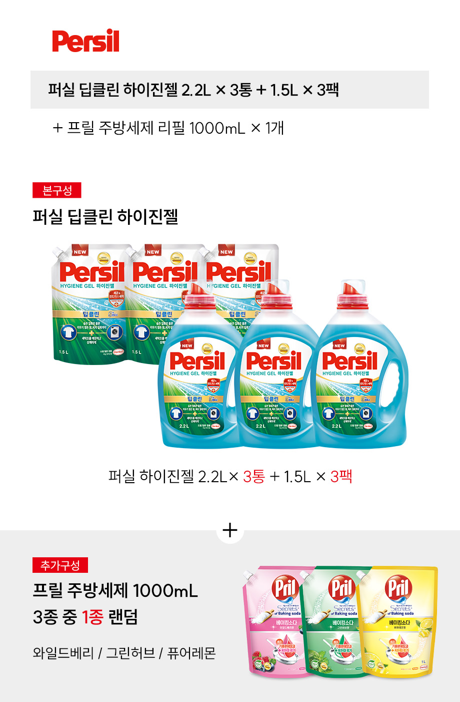 퍼실 하이진젤 2.2L 3개 + 1.5L 3개 + 프릴1L 1개 (일반 드럼 겸용)