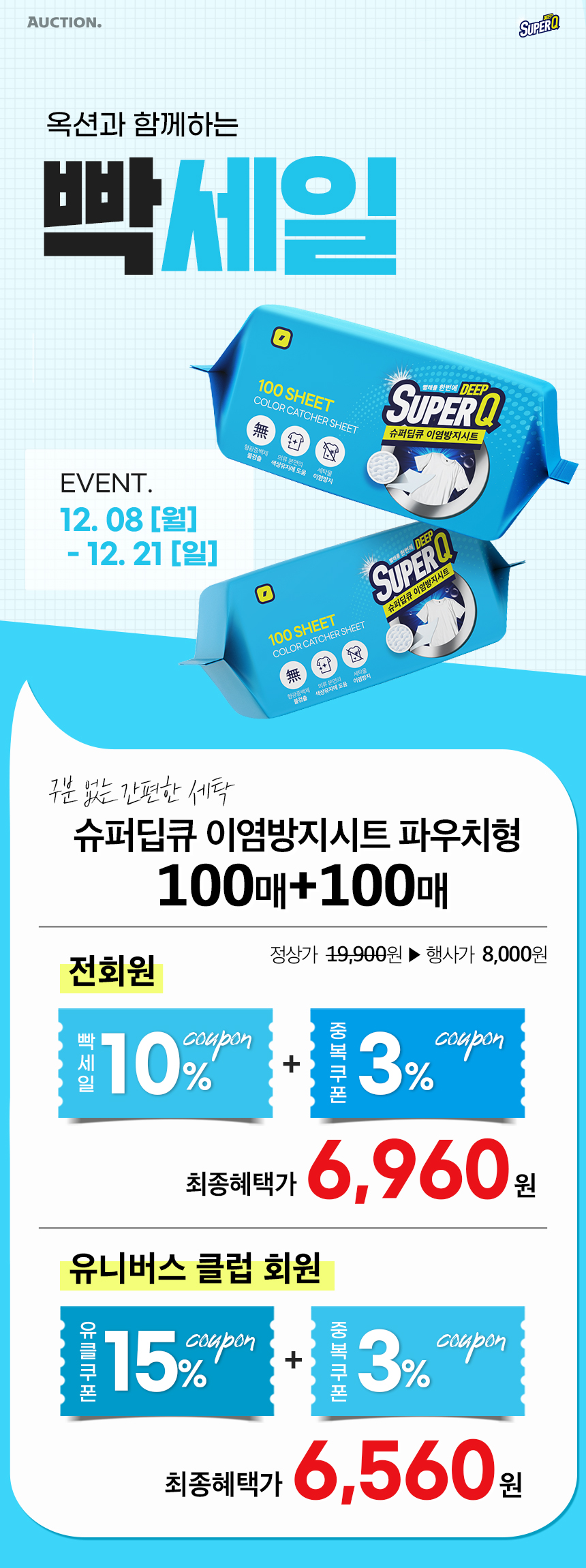 슈퍼딥큐 이염방지시트 100매X2개(총 200매) 미세먼지제거 물빠짐 방지 세탁티슈 흰색옷이염 물빠짐방지제