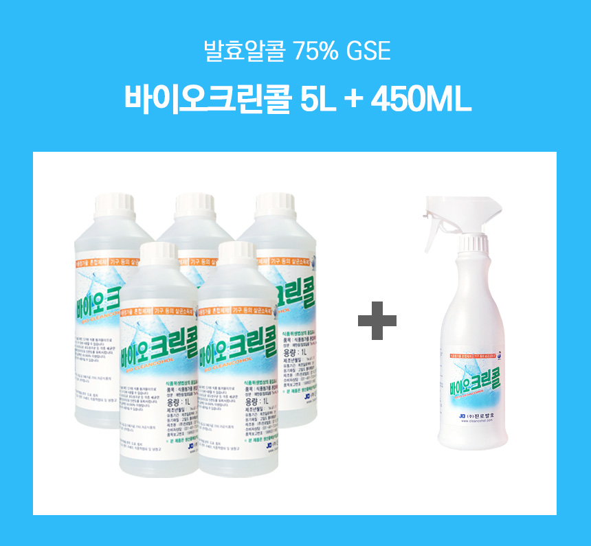 진로발효 단독구성75% 살균소독 바이오크린콜 1Lx 5개 + 450ml x 1개