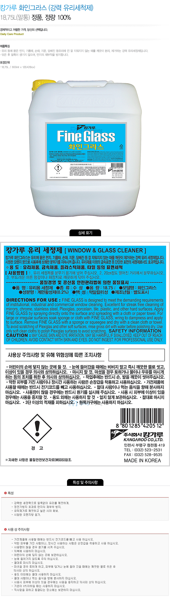 화인그라스 (강력 유리세척제) 18.75L/세제/유리청소