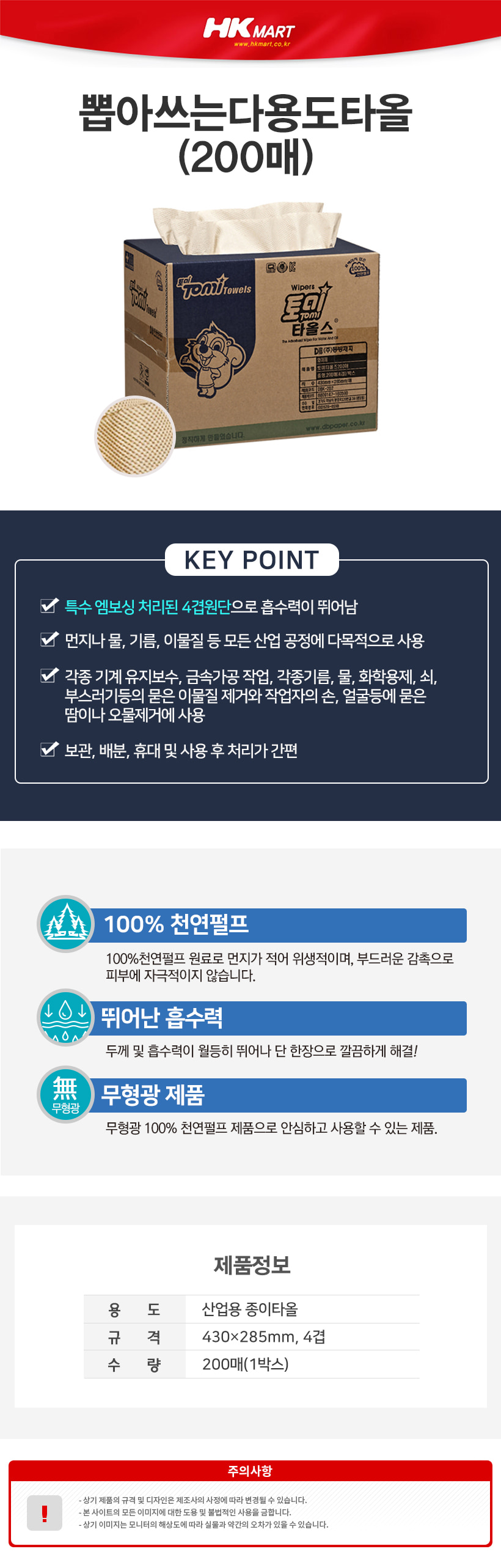 (430285mm/4겹원단) 뽑아쓰는 다용도타올(200매) 천연펄프 뛰어난흡수력 무형광