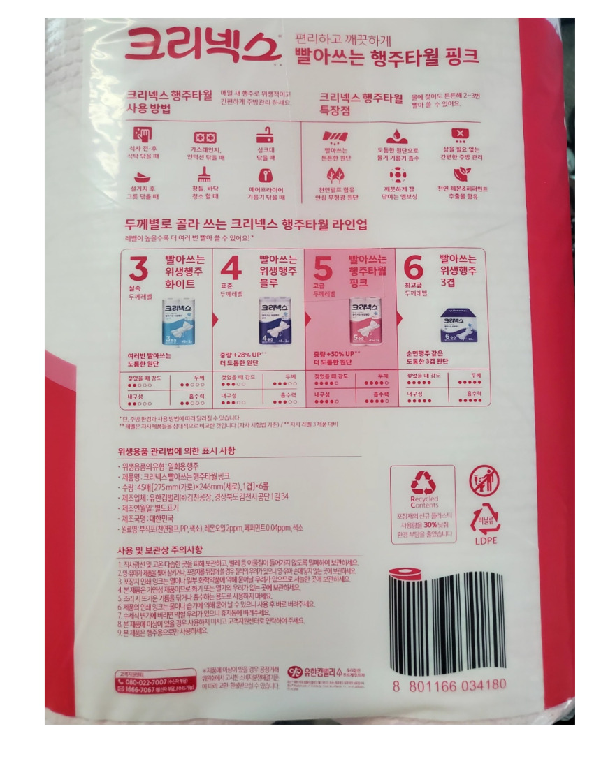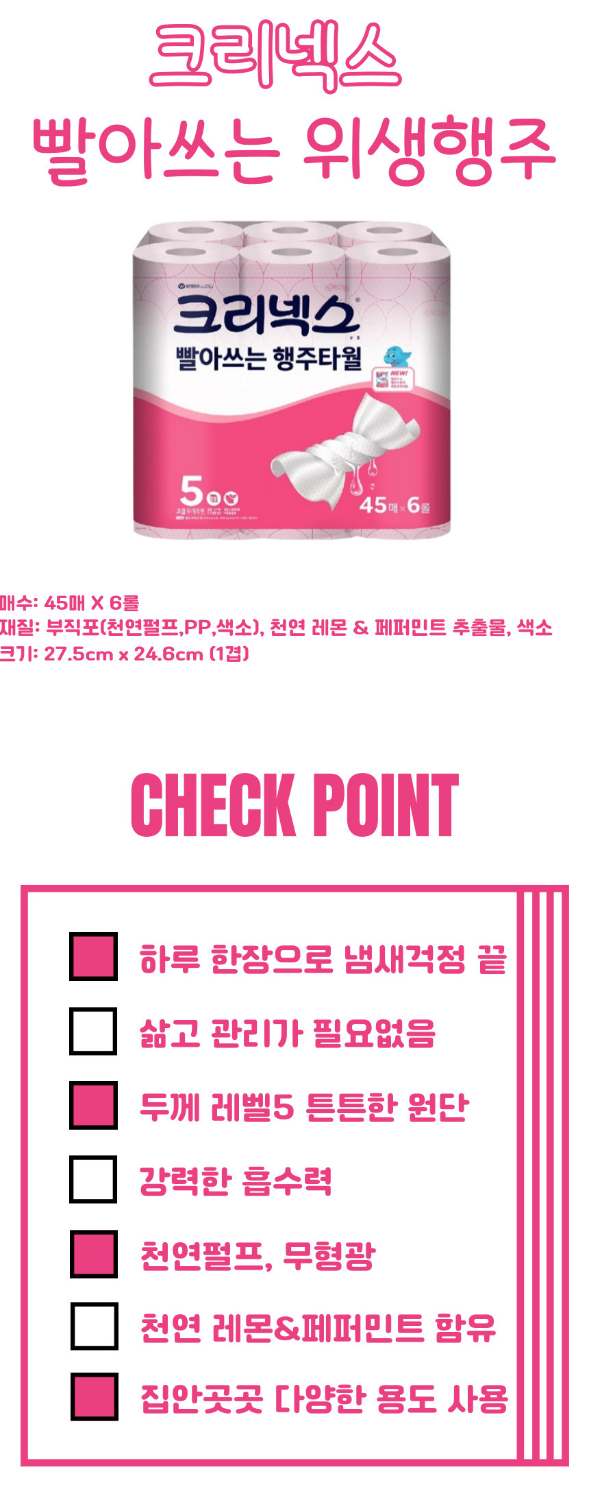 크리넥스 핑크 위생 행주 빨아쓰는 행주타월 45매 x 6롤 스카트
