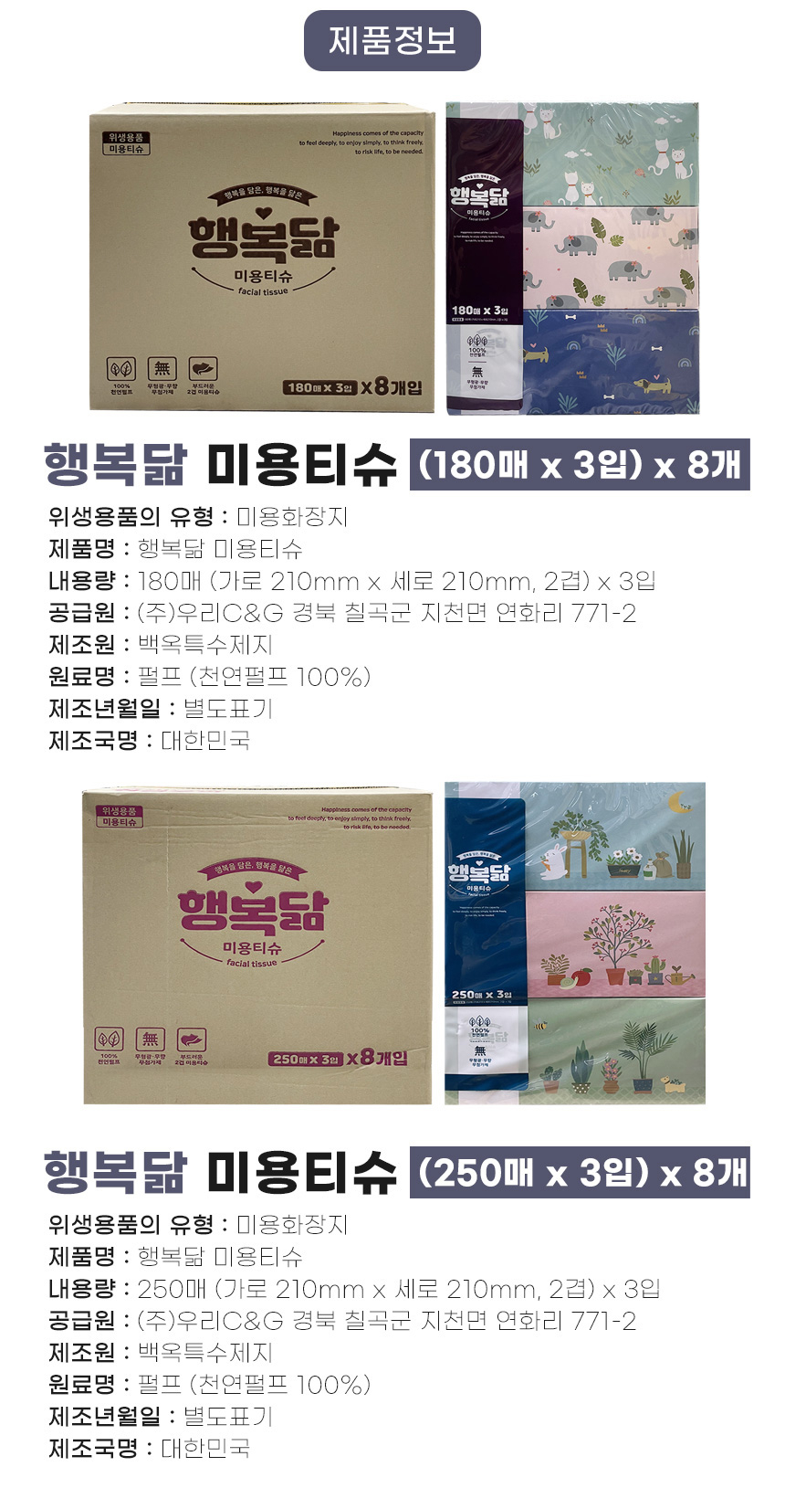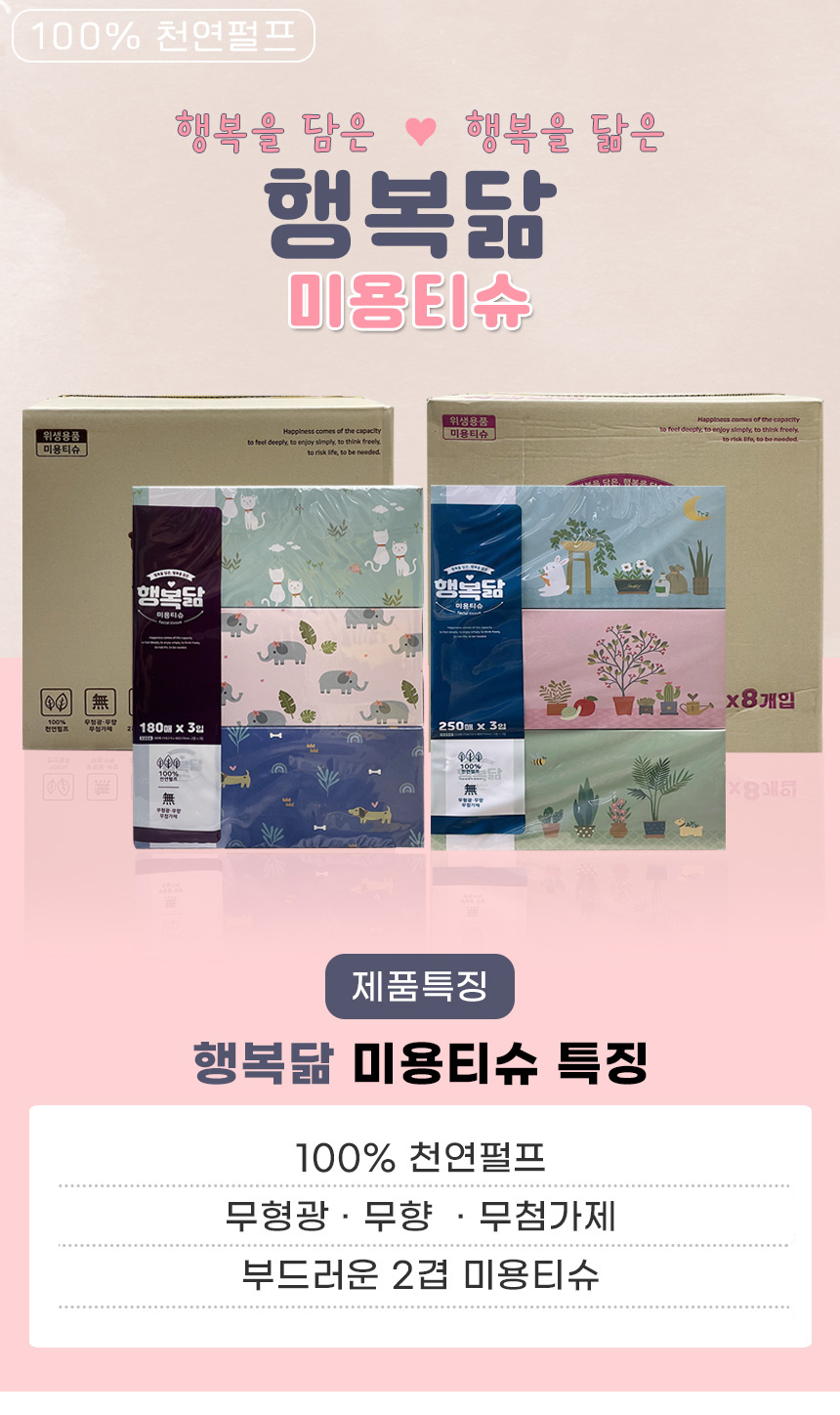 행복닮 미용티슈 250매 3입X 8개 (1박스) / 100%천연펄프 무형광 무향 무첨가제 2겹 미용티슈