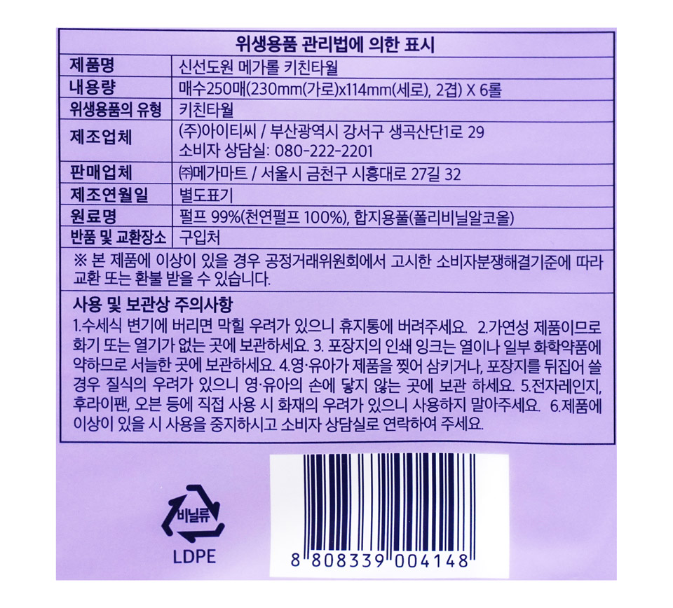 메가마트 신선도원 메가롤 키친타월 250매x6롤x2개
