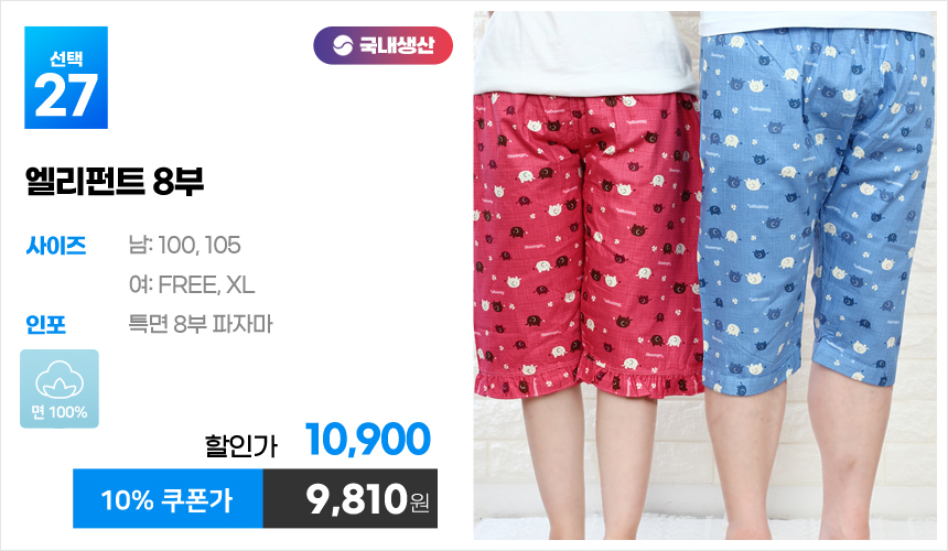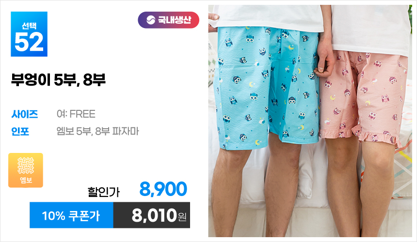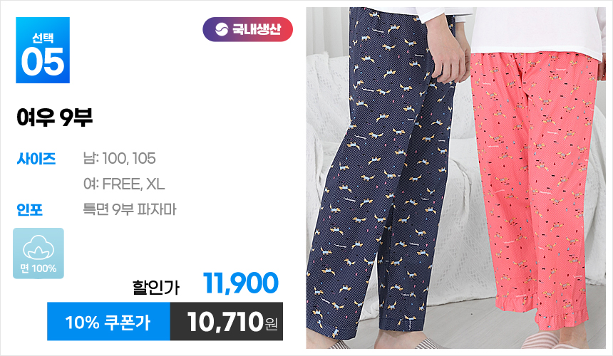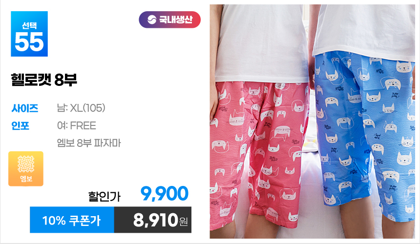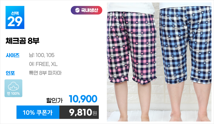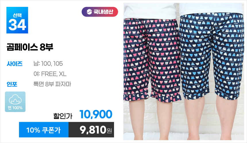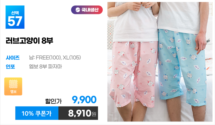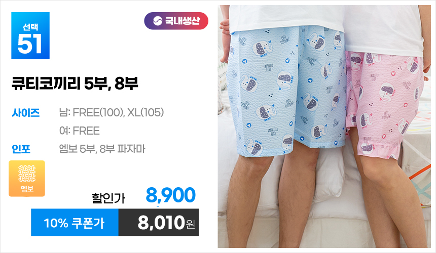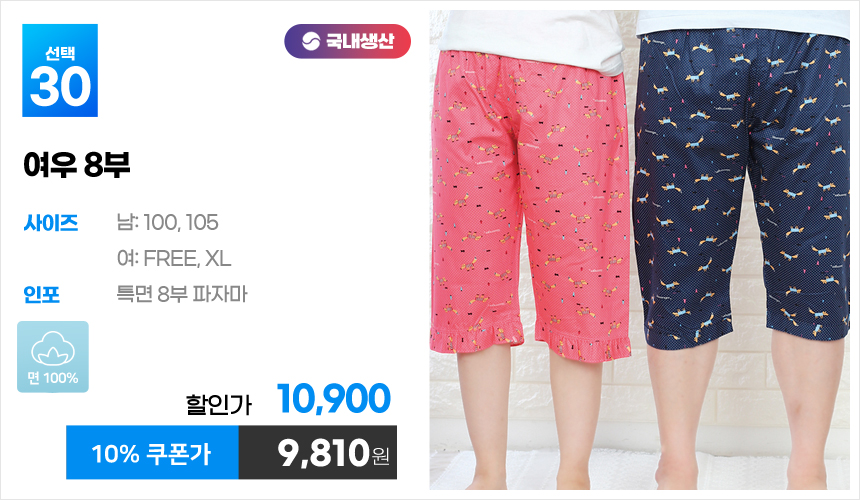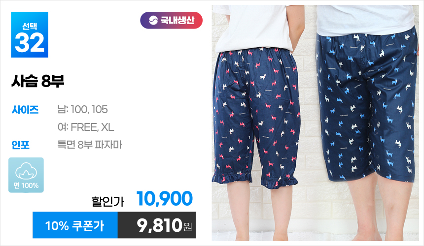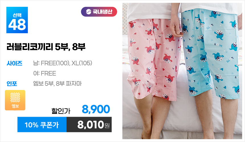 (10%쿠폰)특면 5부 7부 9부 커플 국내산 순면 파자마 남자 여자 홈웨어 잠옷 엠보 수면 바지 반바지