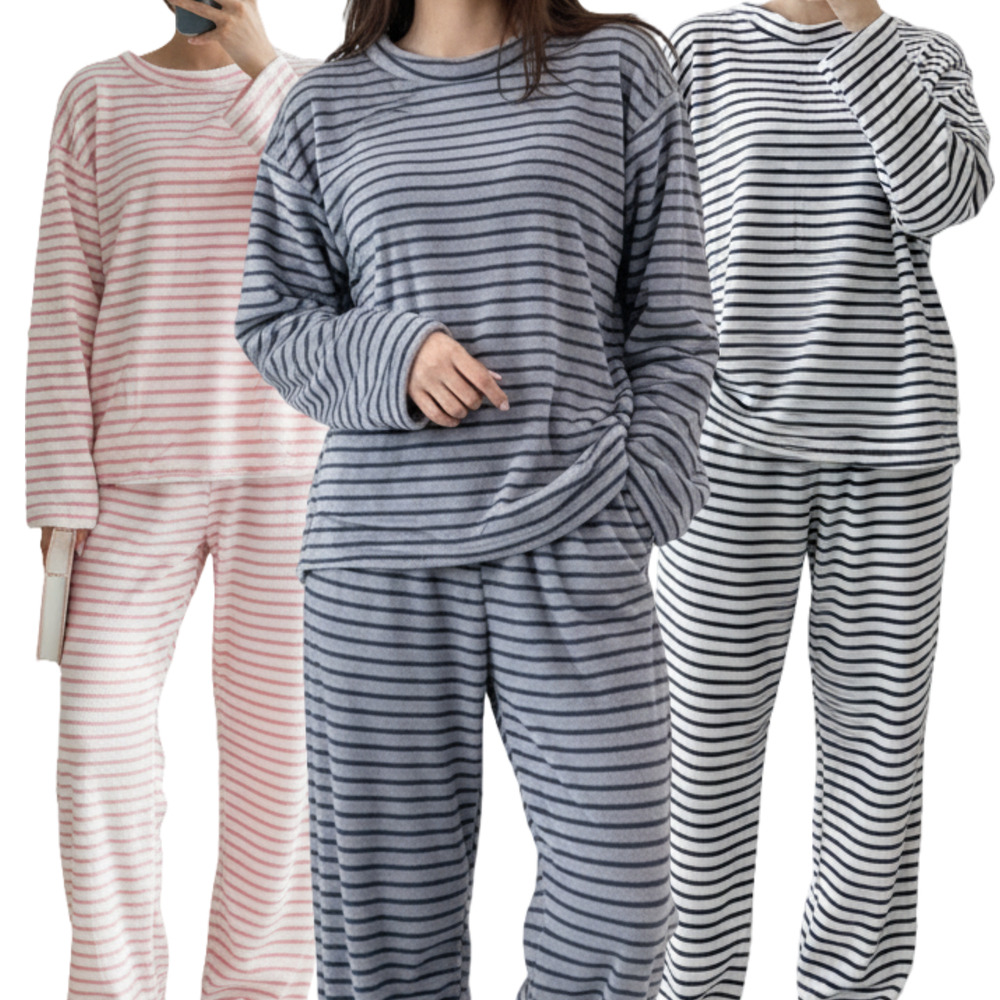 잠옷세트 극세사 단가라 루즈핏 수면잠옷 상하세트 3컬러