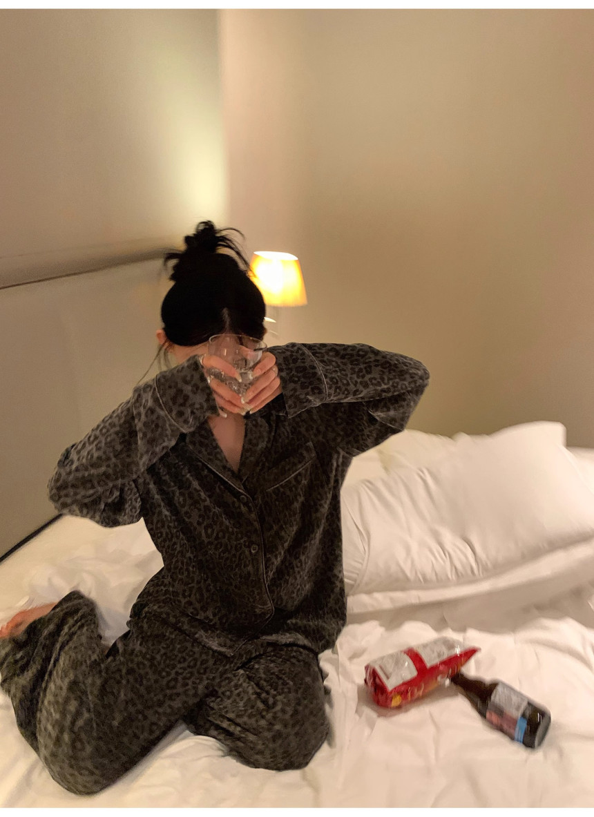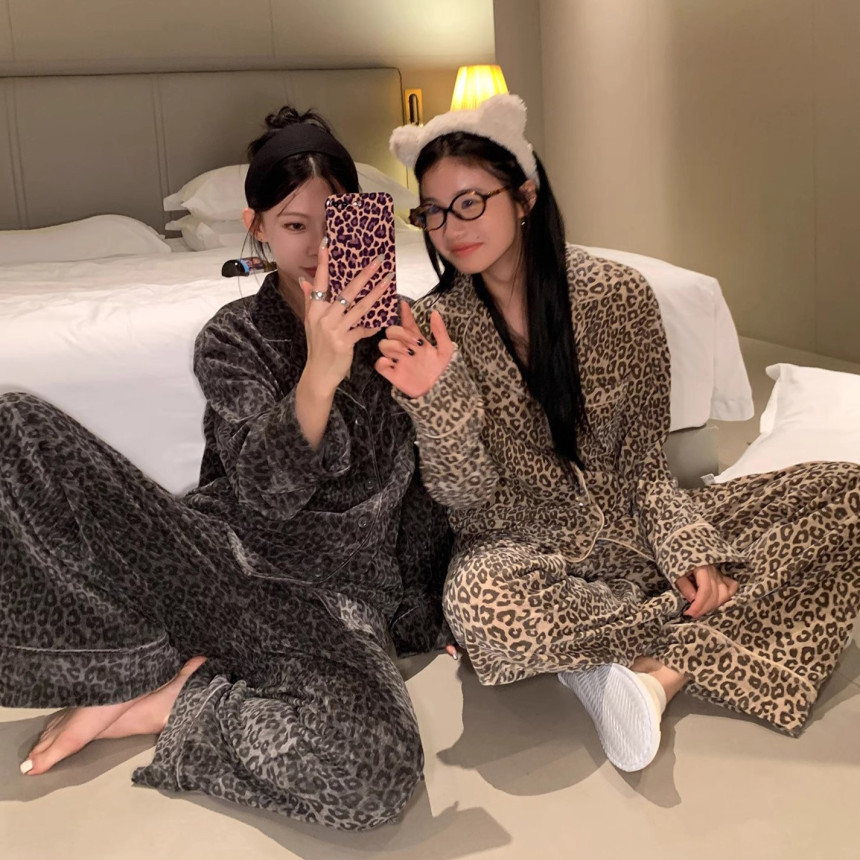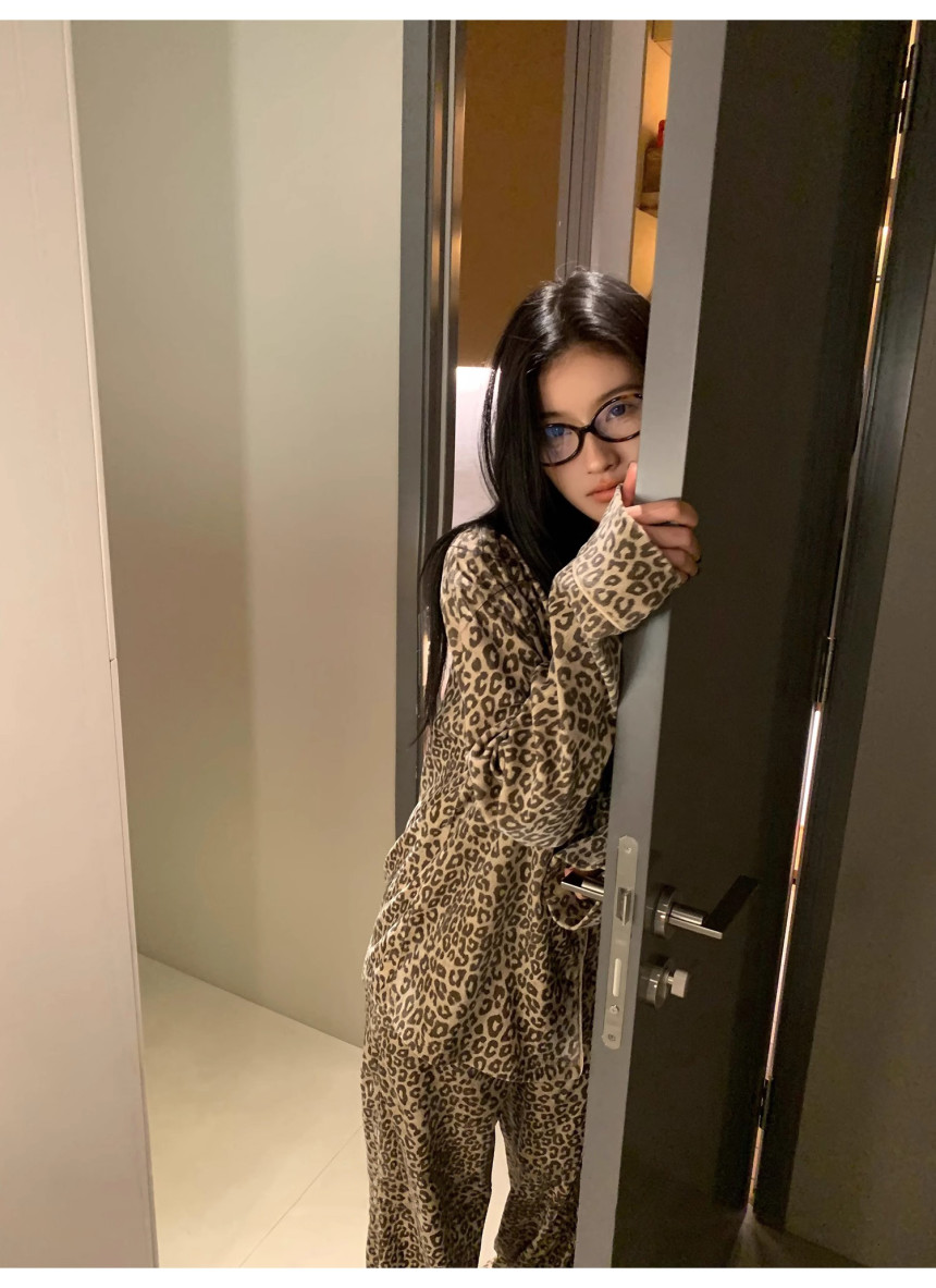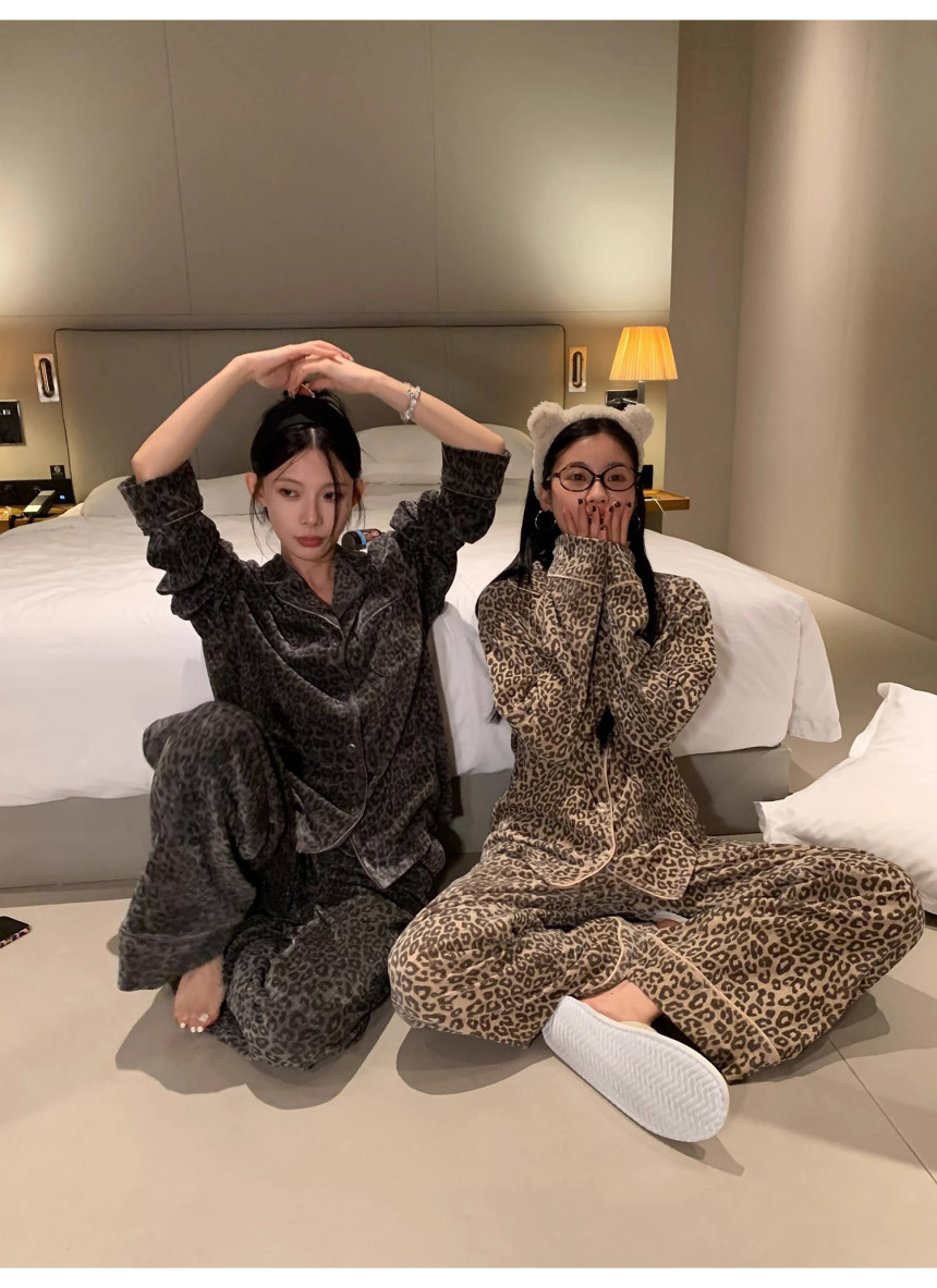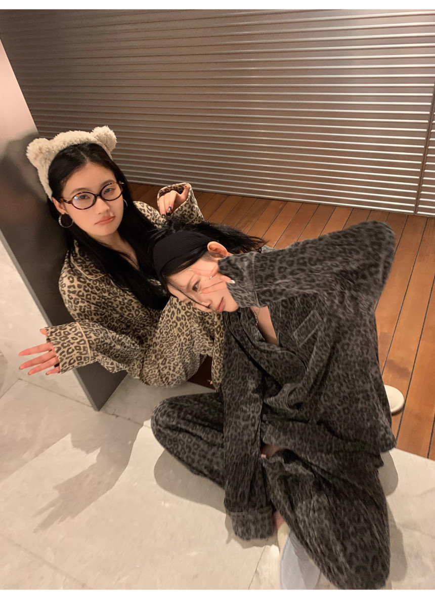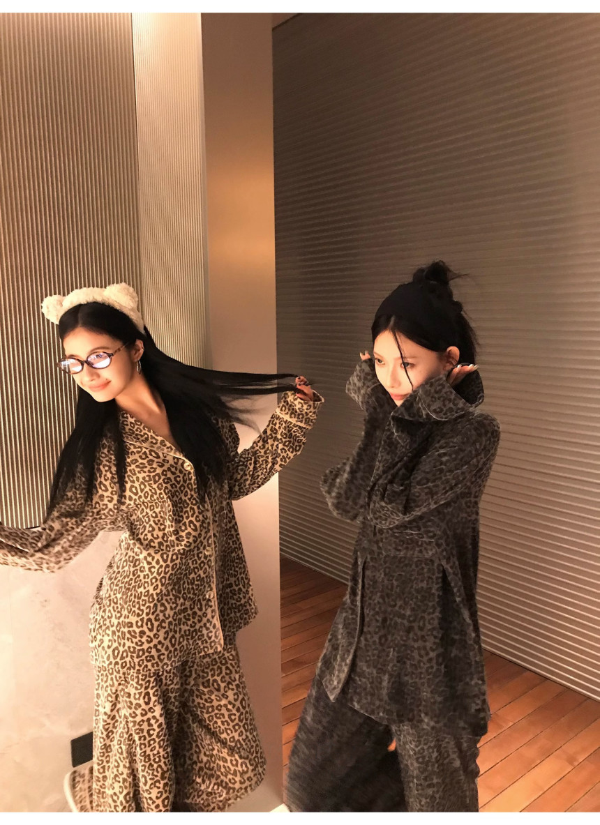 레오파드 수면 파자마 잠옷 호피 여성 기모 벨벳 홈웨어 가을 겨울 빅사이