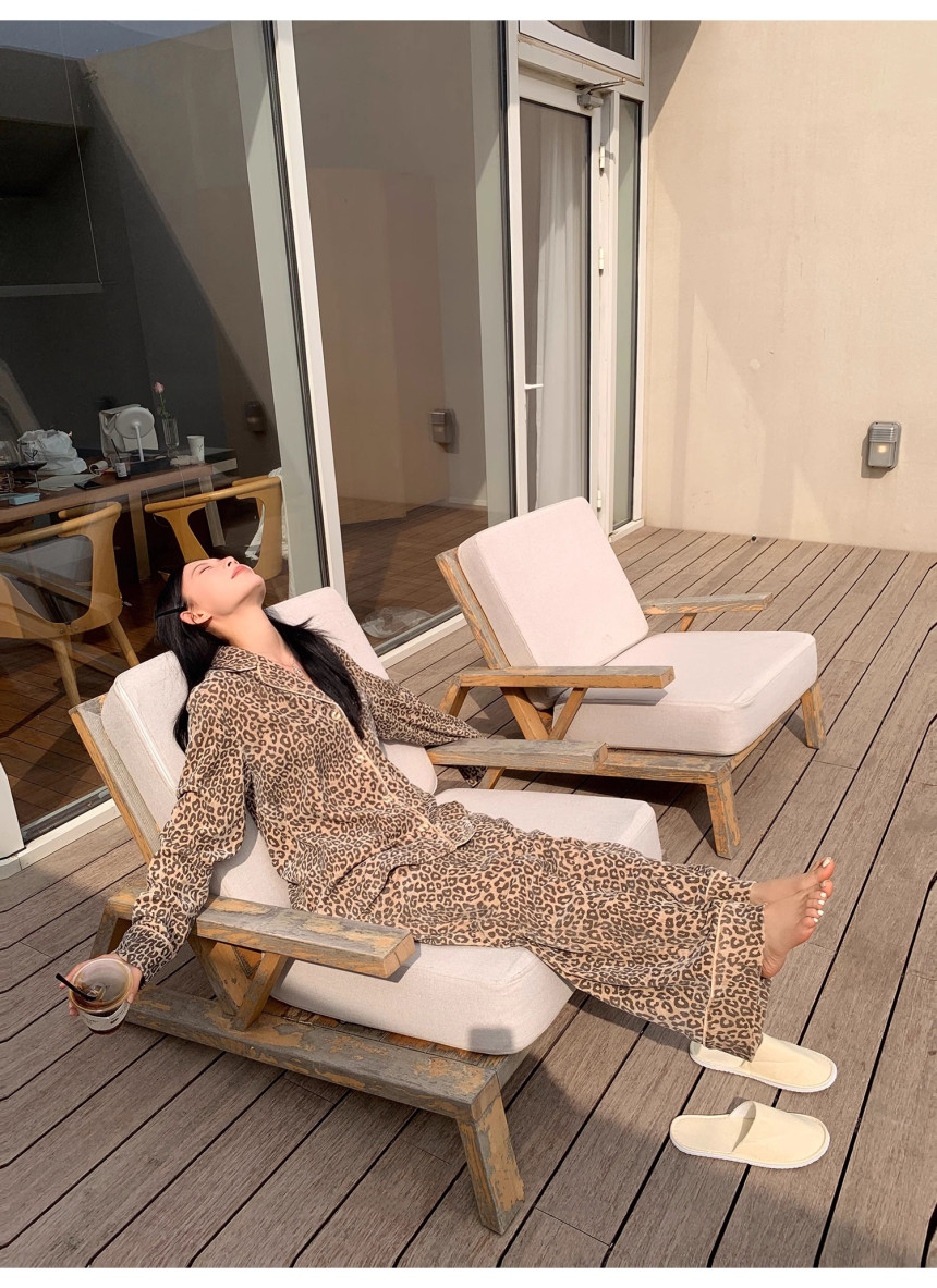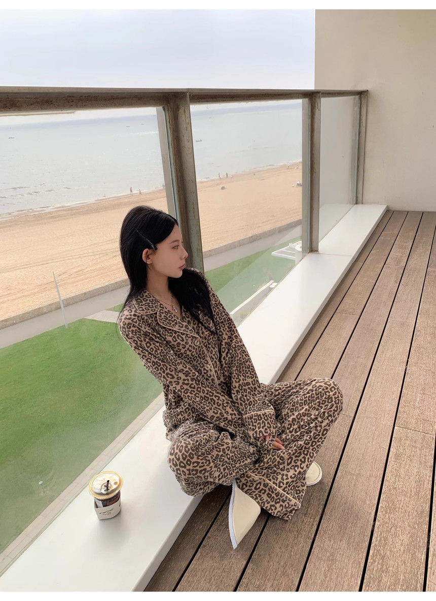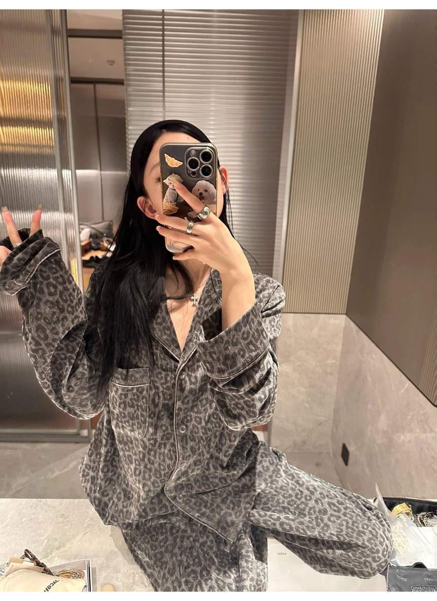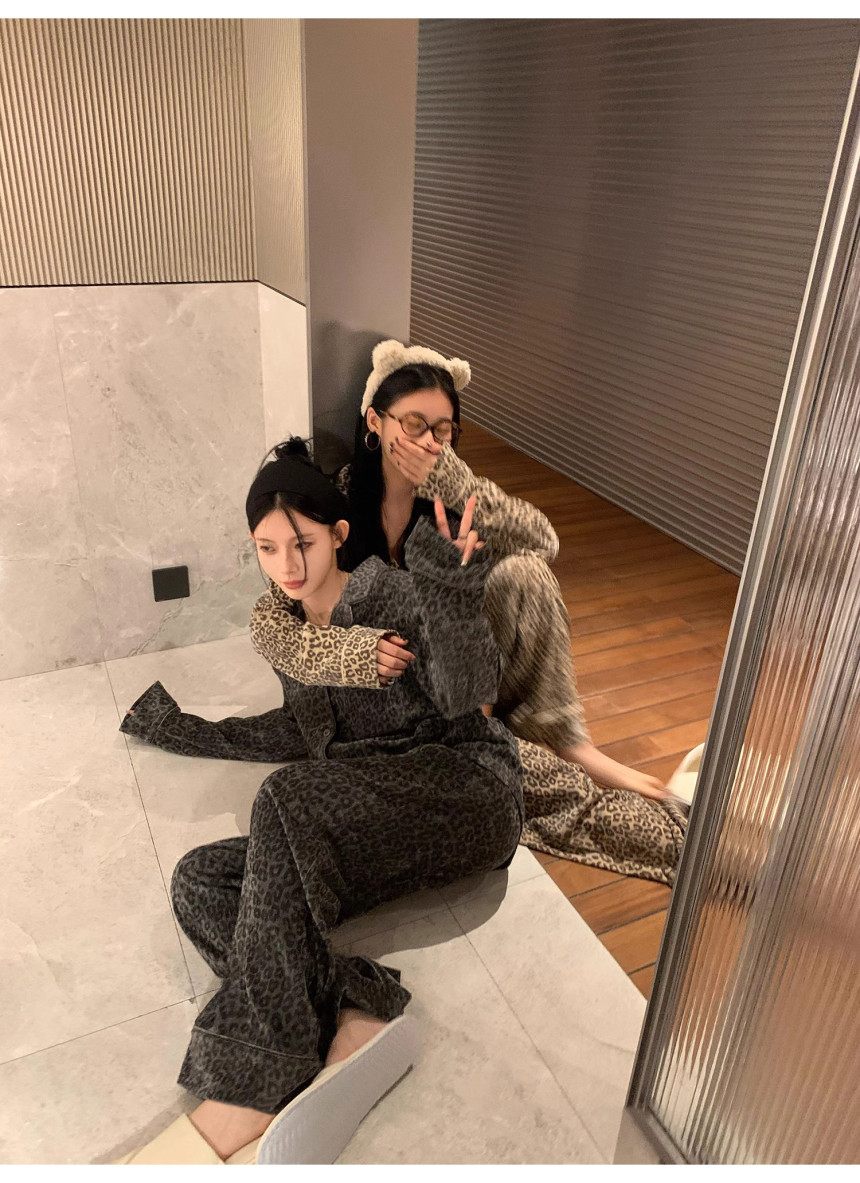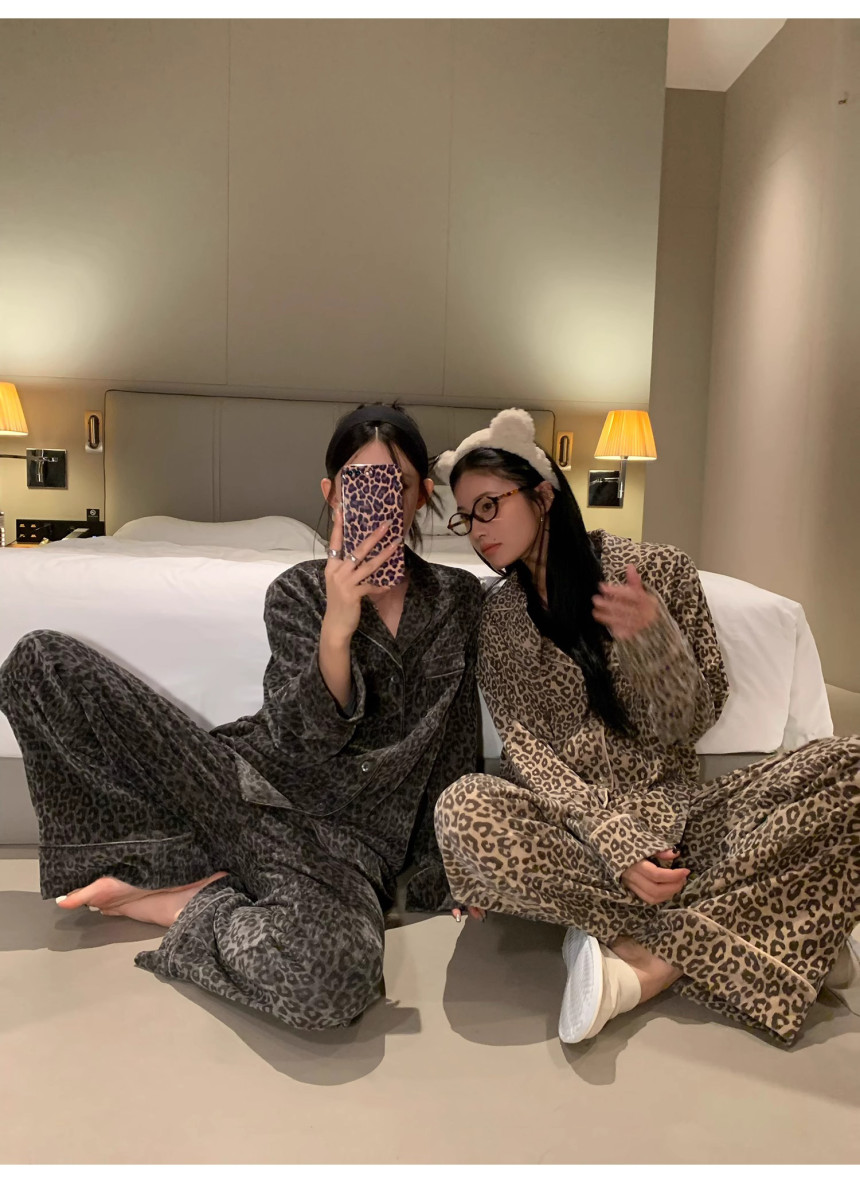 레오파드 수면 파자마 잠옷 호피 여성 기모 벨벳 홈웨어 가을 겨울 빅사이