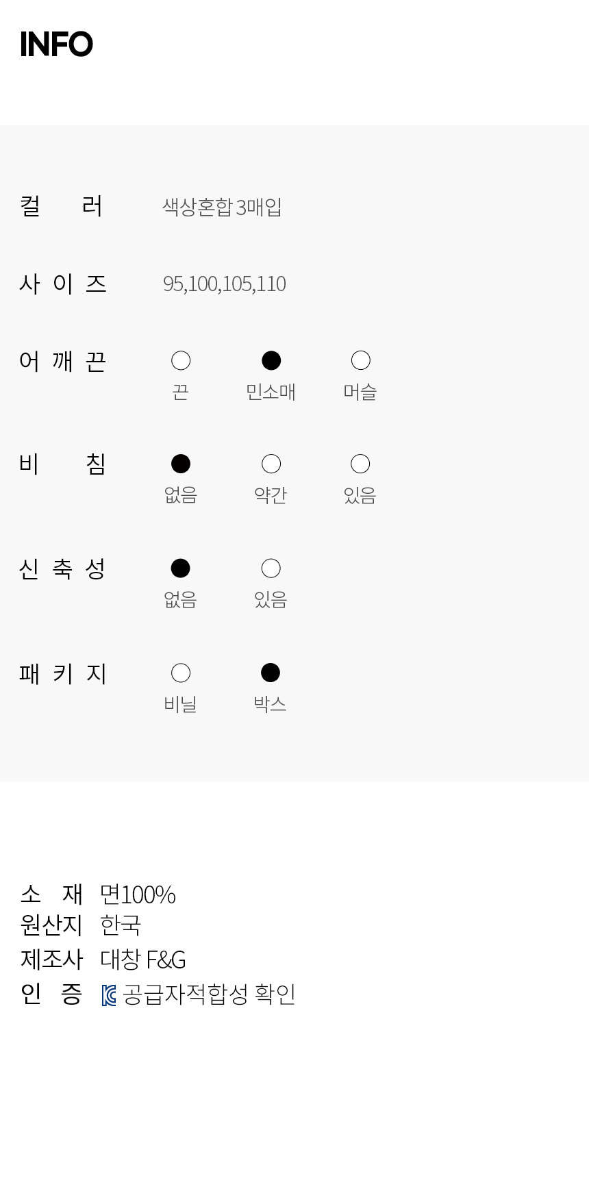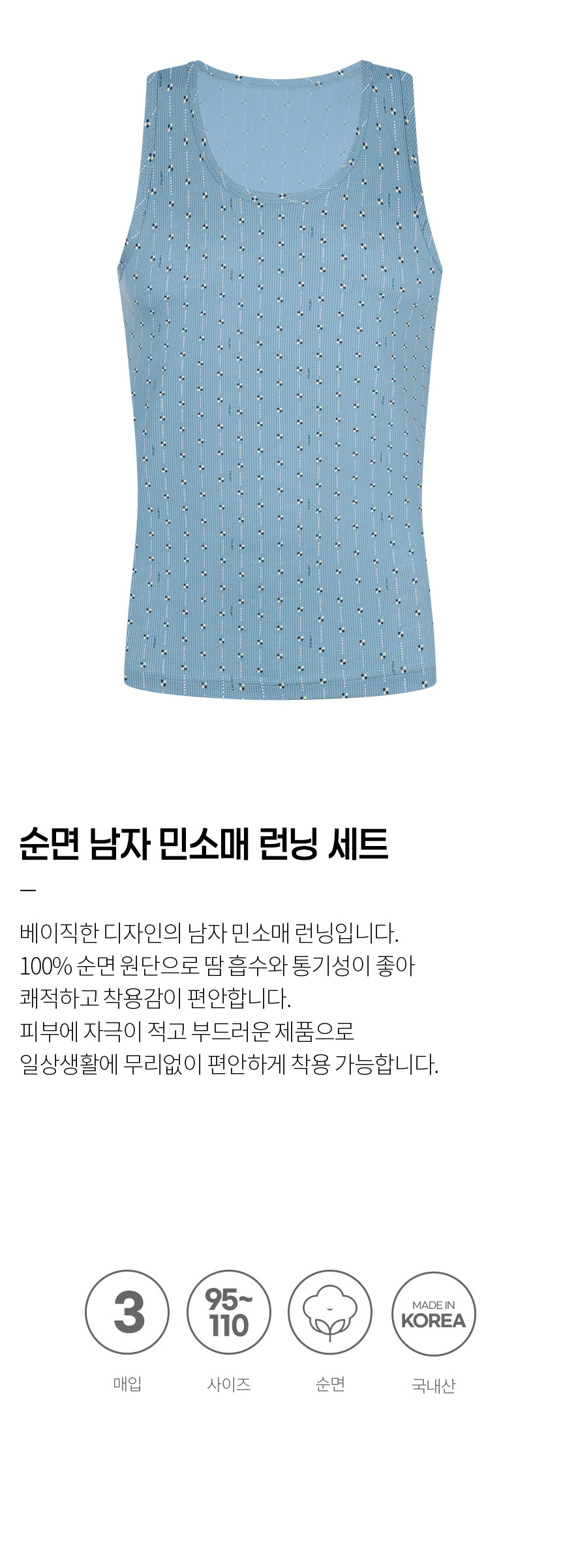 남자면런닝 유색 민소매 메리야스 런닝셔츠 순면 3종 세트