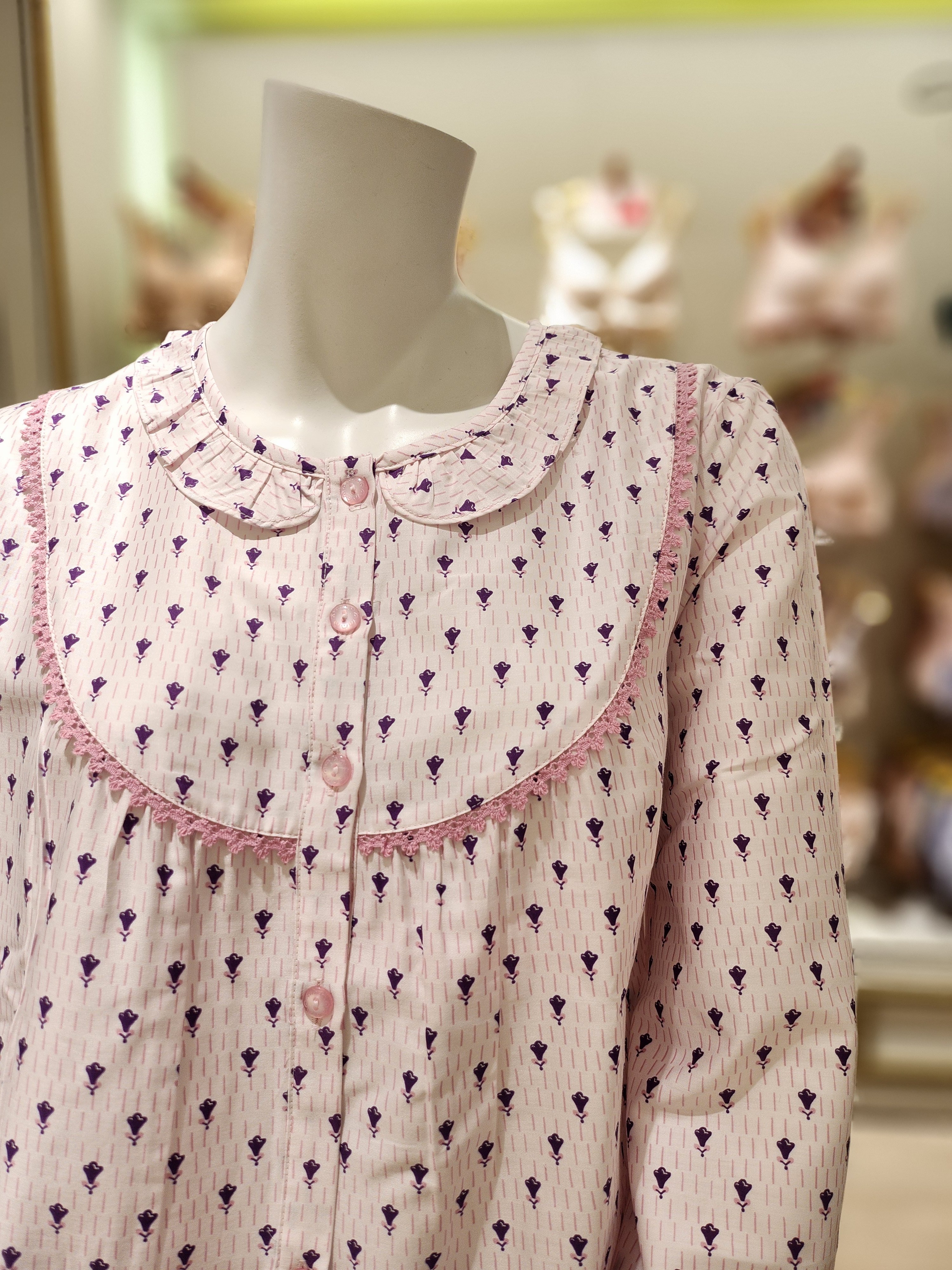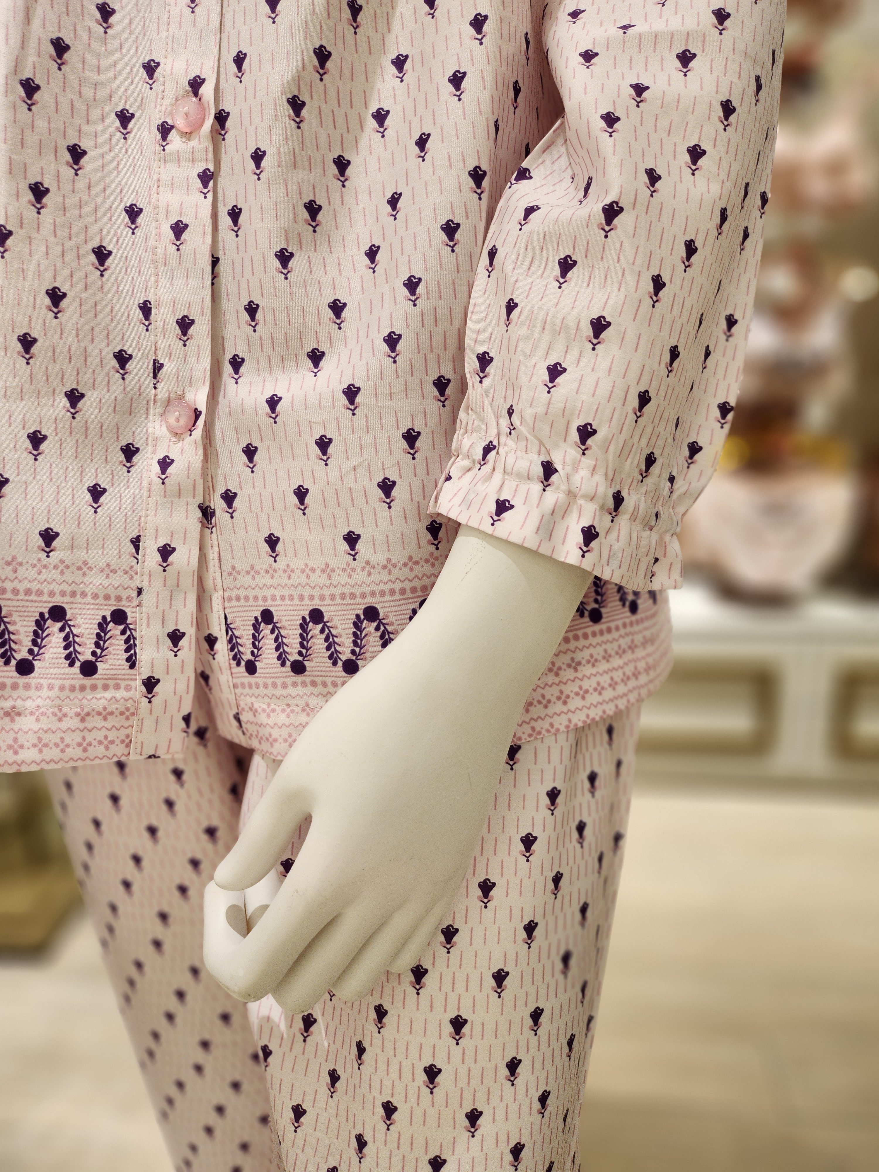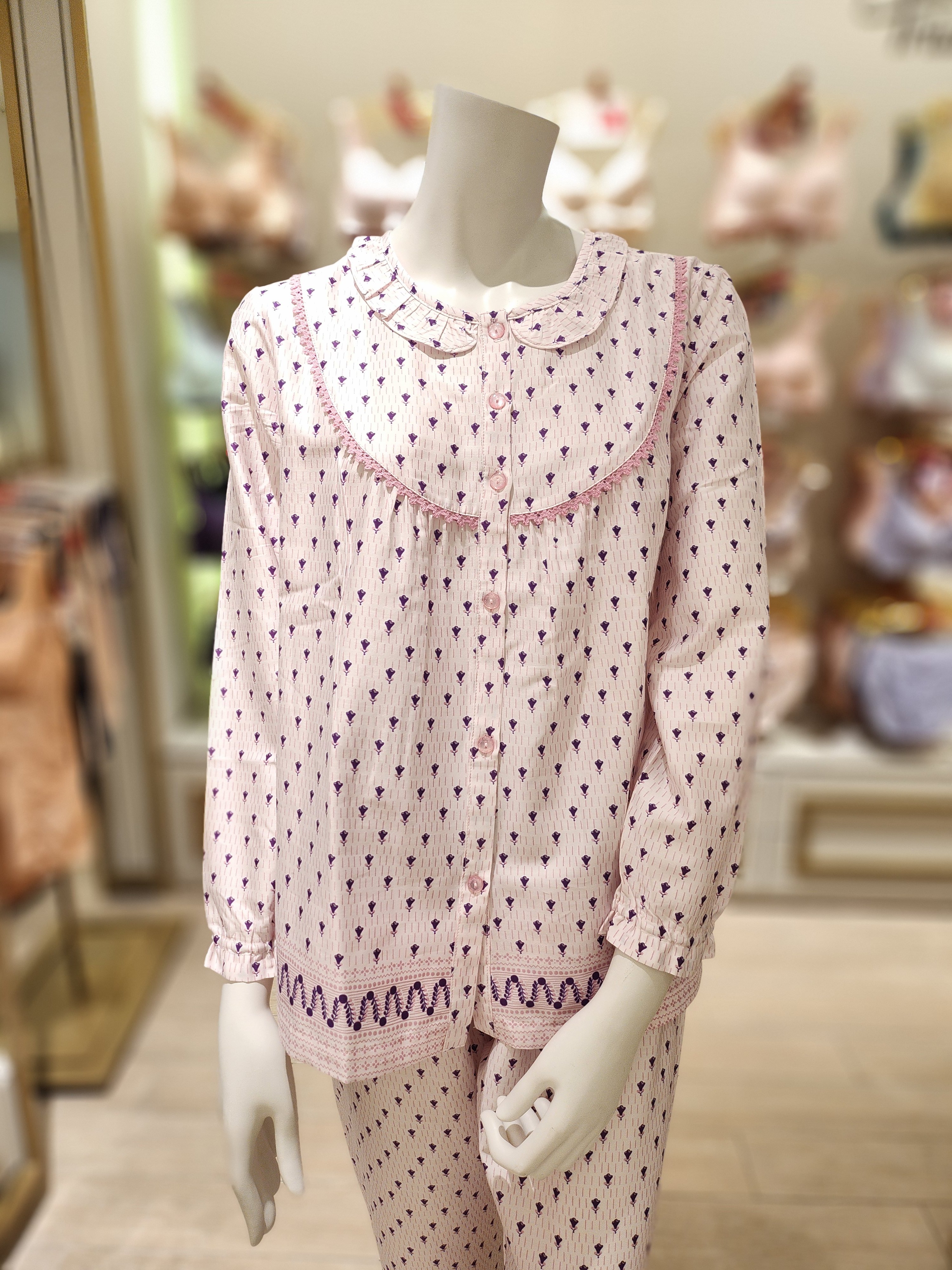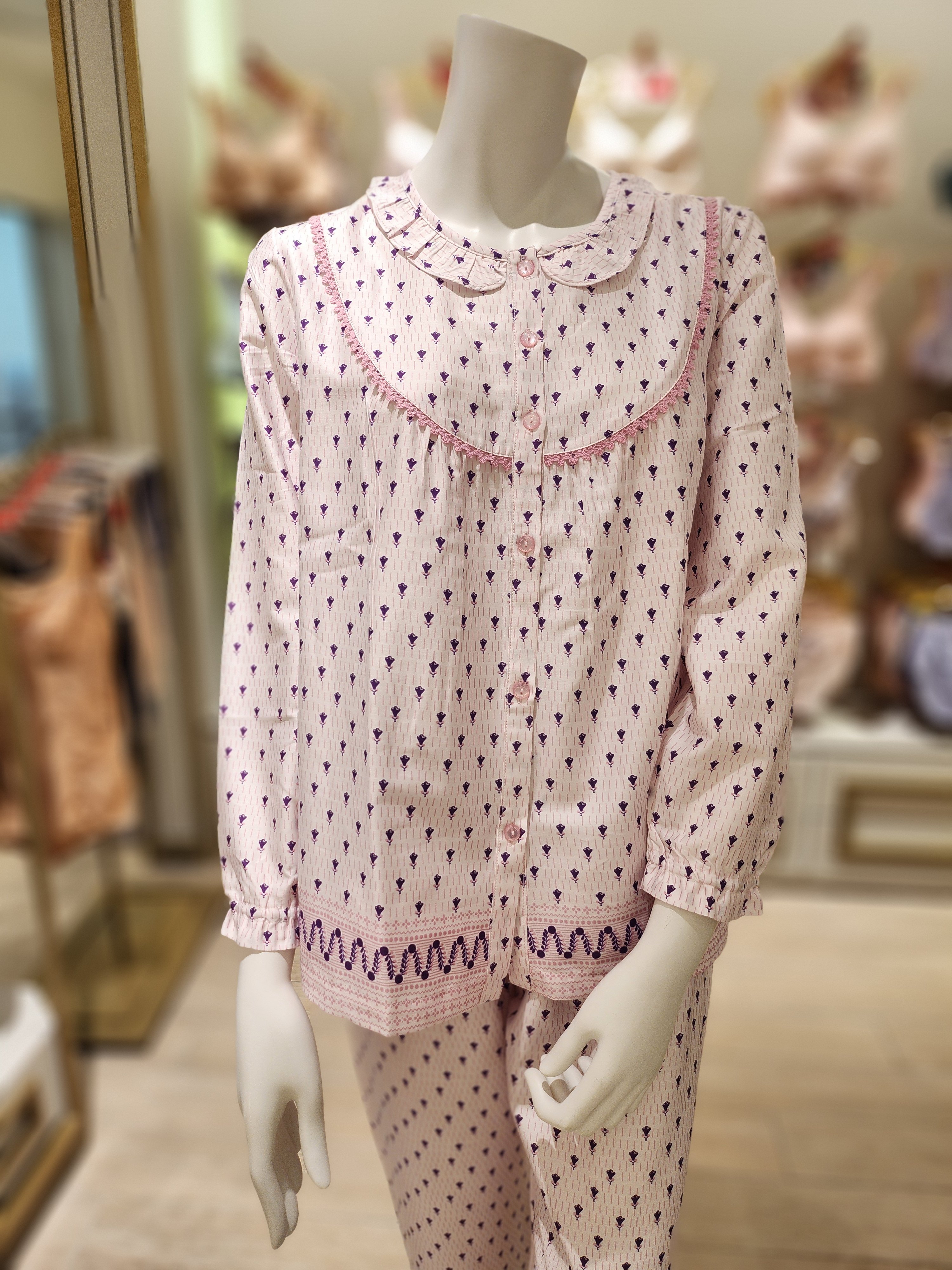 기하학 나염이 돋보이는 80수 면 100% 소재의 여성 파자마세트입니다.