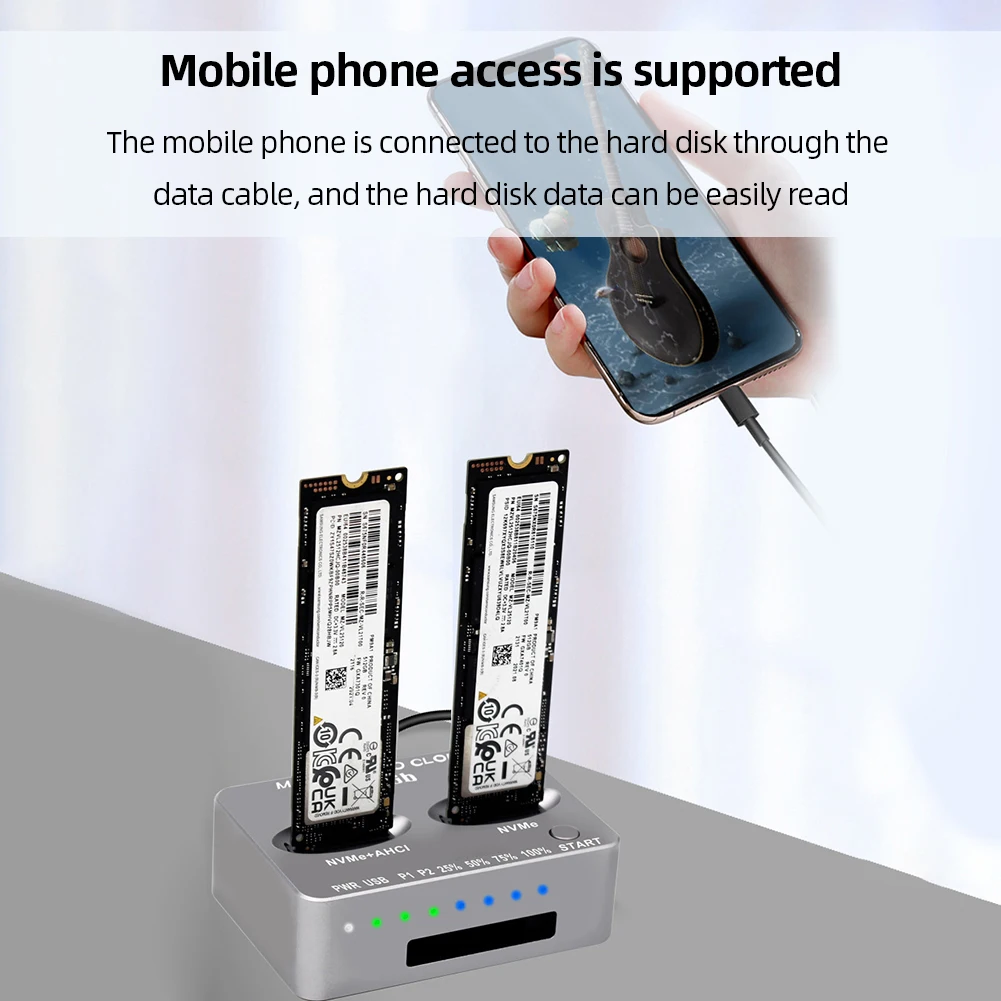 1. 간편한 데이터 백업:컴퓨터에 연결할 필요가 없습니다! 두 하드 드라이브를 NVME 도킹 스테이션에 연결하고 복제 버튼을 누르면 소스 드라이브에서 대상 드라이브로 데이터를 쉽게 복사 할 수 있습니다. 이전과 같이 데이터 백업 프로세스를 간소화.