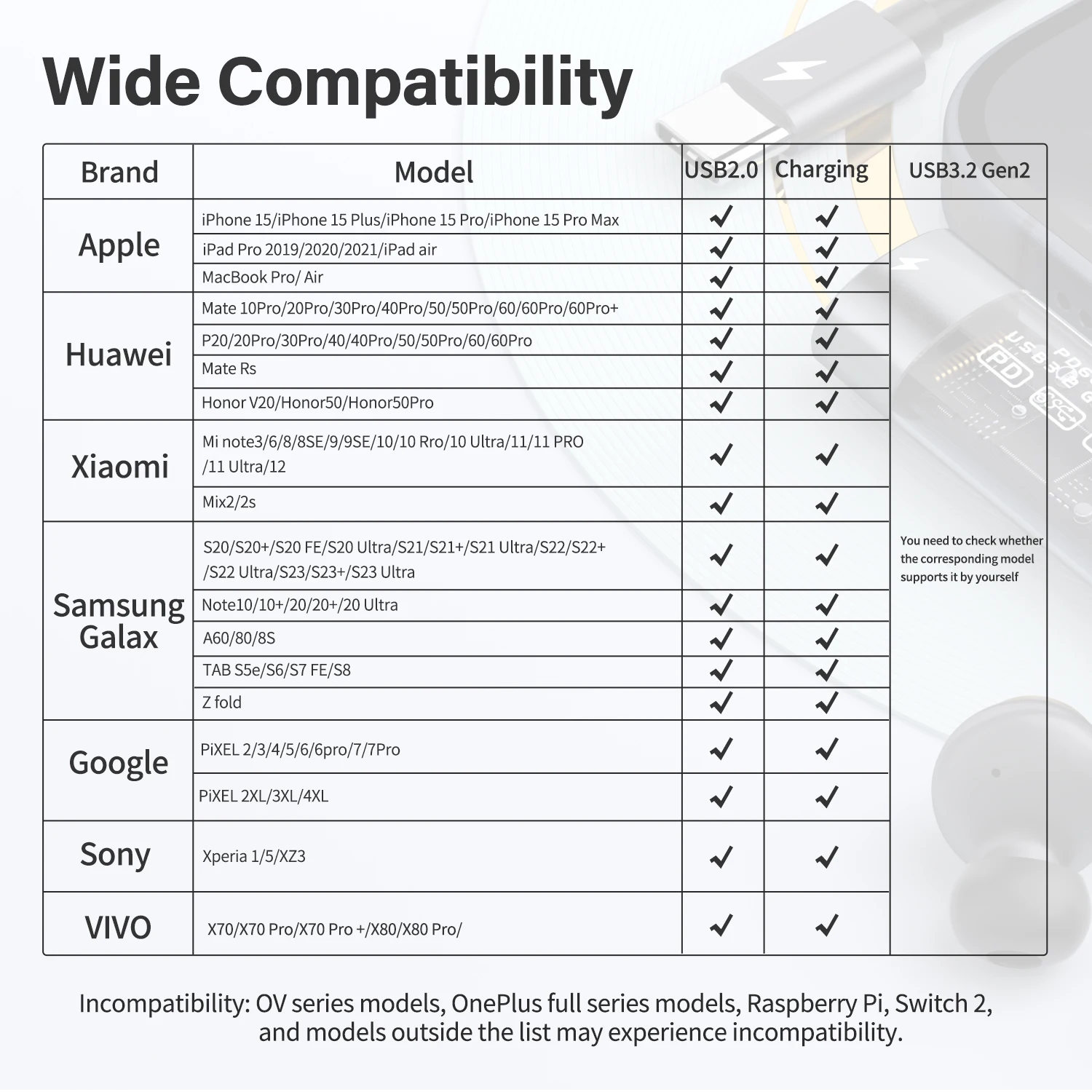 추신: 위의 모델은 모든 시리즈가 아니며 최신 모델에 맞게 지속적으로 업데이트됩니다. 이 제품은 대부분의 USB Type C 인터페이스 휴대폰 및 태블릿도 지원합니다. 전화기가 호환되는지 확실하지 않은 경우 고객 서비스에 문의하십시오. 가능한 한 빨리 연락 드리겠습니다.