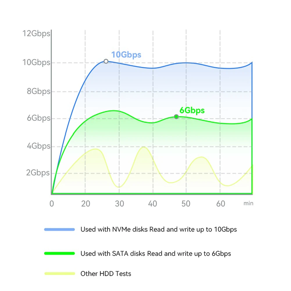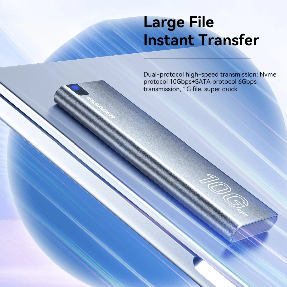 2. 고속 이중 프로토콜 전송:10Gbps 및 6Gbps 전송 속도를 제공하는 SATA 프로토콜을 제공하는 Nvme 프로토콜을 통해이 휴대용 하드 디스크 상자는 빠른 데이터 전송을 보장합니다. 1GB 파일을 즉시 전송하고 빠른 성능을 즐기십시오.