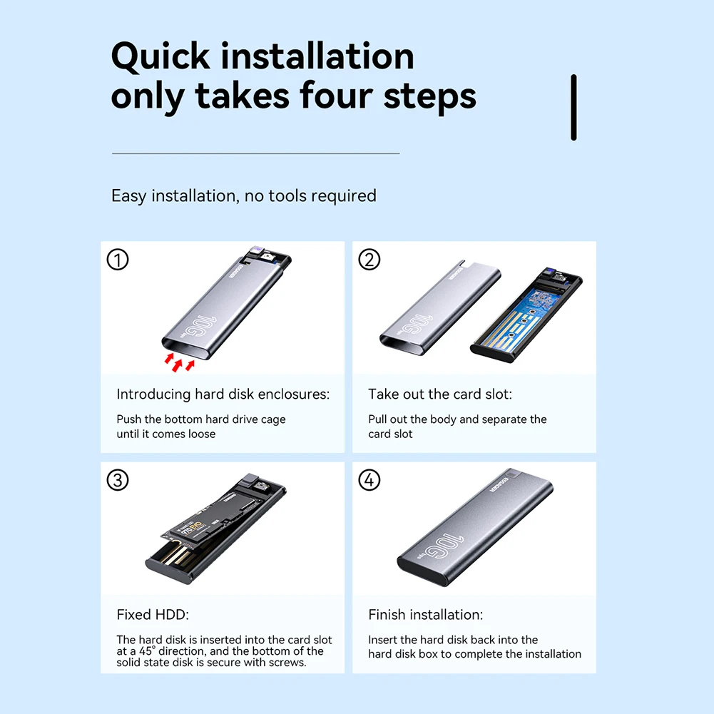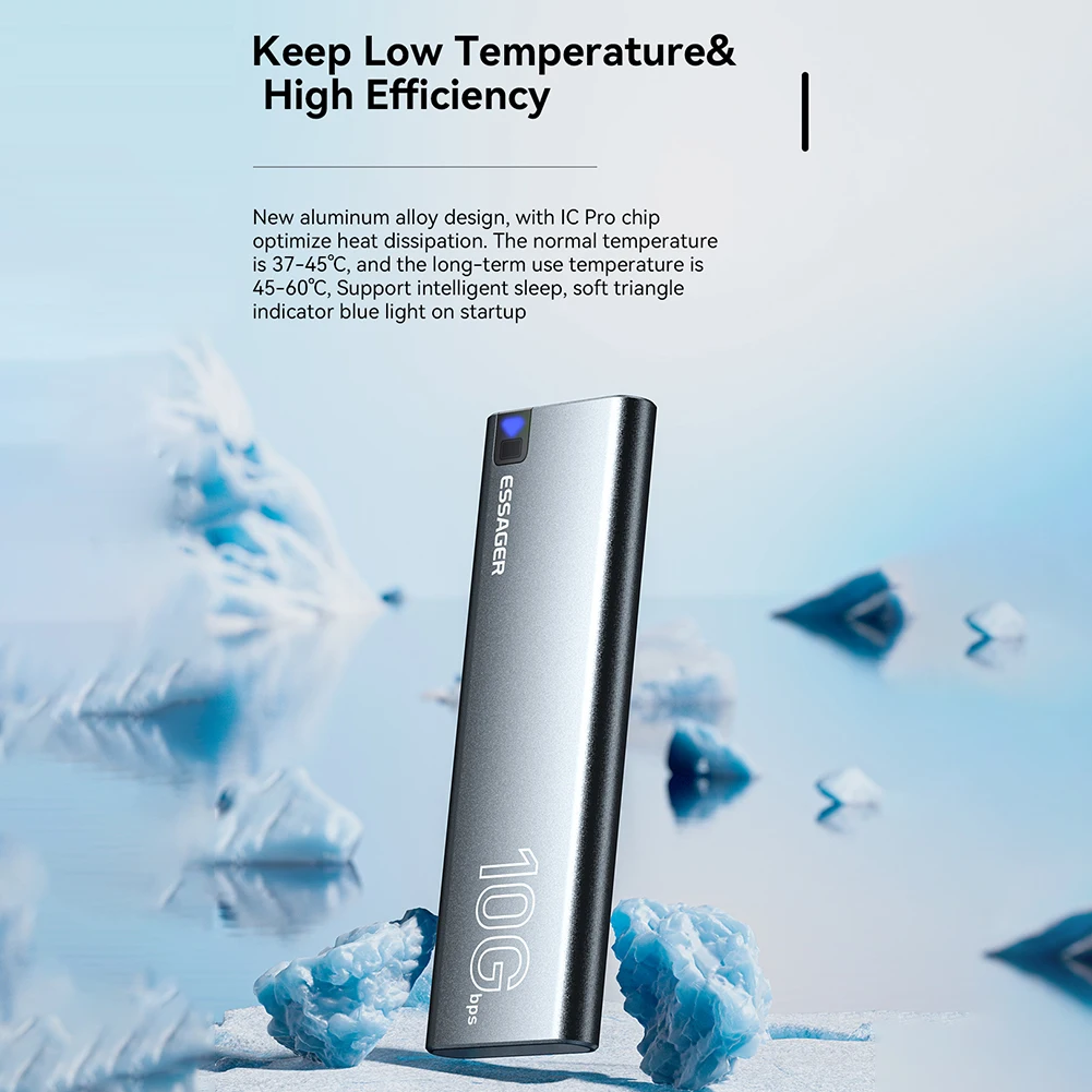 4. 프리미엄 알루미늄 합금 설계:하드 드라이브 인클로저는 매끄럽고 튼튼한 알루미늄 합금 디자인을 자랑합니다. IC Pro 칩은 열 방출을 최적화하여 정상 사용 시 섭씨 37-45 도, 장기간 사용 시 섭씨 45-60 도 사이의 온도를 유지합니다. 또한 지능형 절전 모드를 지원하며 시작시 파란색 LED 표시등이 켜집니다.