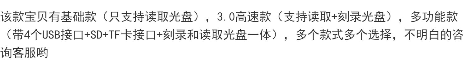 색상 분류 : 3 CD 그래픽 미학 USB3.0 전 시리즈 디스크 읽기+쓰기 CD/DVD/VCD 고속률 ![]() | 색상 분류 : 4 다용도 수입 무브먼트 USB 4개+TF/SD 카드 인터페이스 전 시리즈 디스크 읽기+CD/DVD/VCD 기록/고속도 ![]() |
