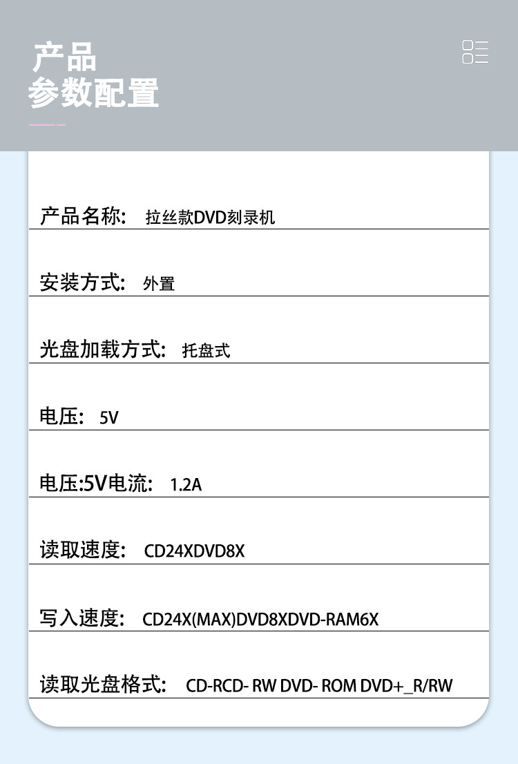 색상 분류 : 1 스탠다드 USB2.0 CD/DVD/VCD 디스크 읽기 지원/기록 없음 ![]() | 색상 분류 : 2 프리미엄 90 추천 수입 무브먼트 USB3.0 전시리즈 디스크리딩+CD/DVD/VCD레코딩/고속도 ![]() |