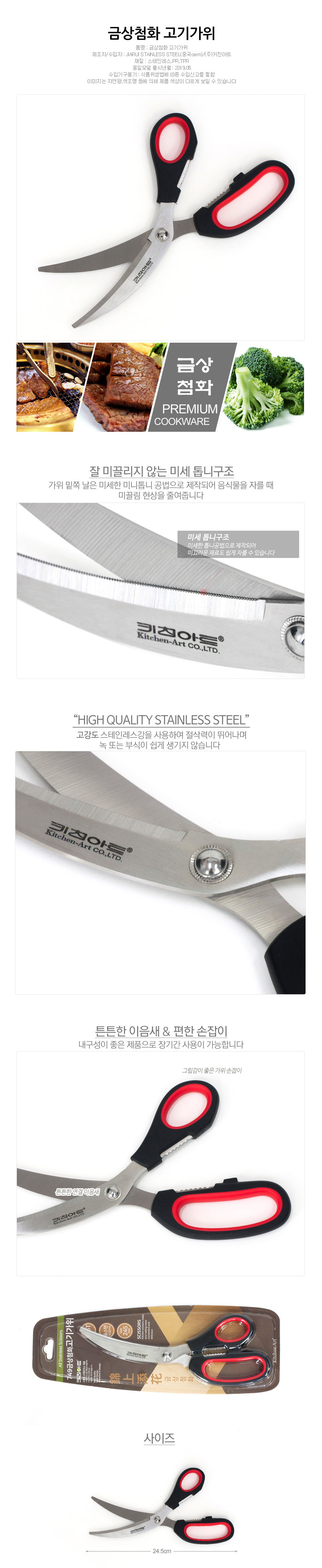 키친아트 금상첨화 가위 / 고기가위미세한 미니 톱니 공법으로 제작되어 미끄러지지 않아 편리하고 안전한 주방가위입니다. 고강도 스테인레스강 소재로 절삭력이 뛰어나며 녹이나 부식이 쉽게 생기지 않습니다. 튼튼한 이음새와 그립감이 좋은 손잡이로 편리하며 내구성이 좋아 오랫동안 사용할 수 있습니다.