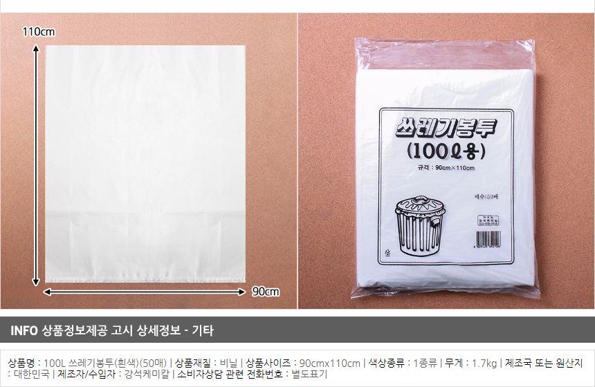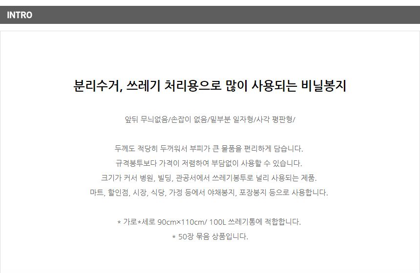 | 상품용도 및 특징 | 분리수거, 쓰레기 처리용으로 많이 사용되는 비닐봉지. 앞뒤 무늬없음/손잡이 없음/밑부분 일자형/사각 평판형/ 두께도 적당히 두꺼워서 부피가 큰 물품을 편리하게 담습니다. 규격봉투보다 가격이 저렴하여 부담없이 사용할 수 있습니다. 크기가 커서 병원, 빌딩, 관공서에서 쓰레기봉투로 널리 사용되는 제품. 마트, 할인점, 시장, 식당, 가정 등에서 야채봉지, 포장봉지 등으로 사용합니다. * 가로*세로 90cmx110cm/ 100L 쓰레기통에 적합합니다. * 50장 묶음 상품입니다. |