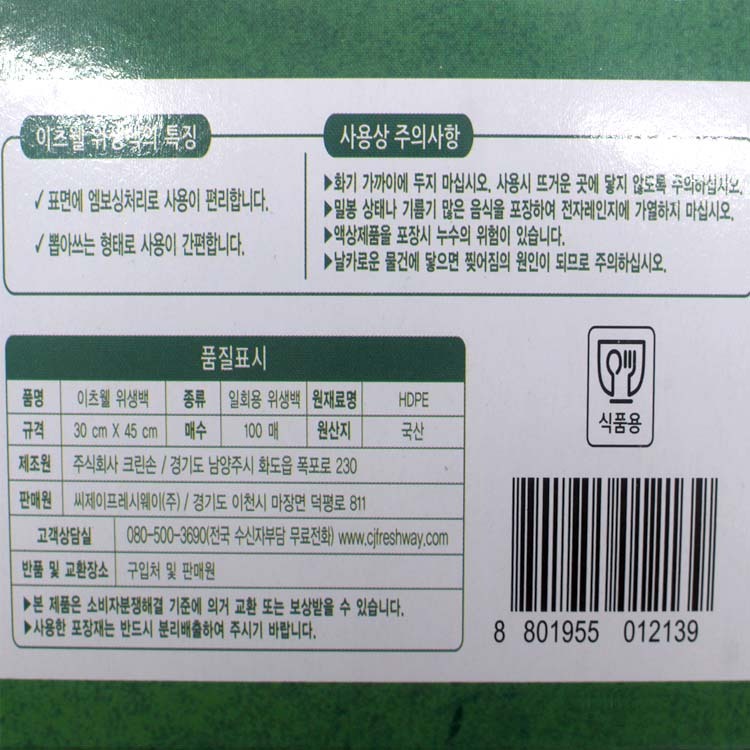 CJ 이츠웰 위생백 30cm 45cm 100매 50개 /무료배송