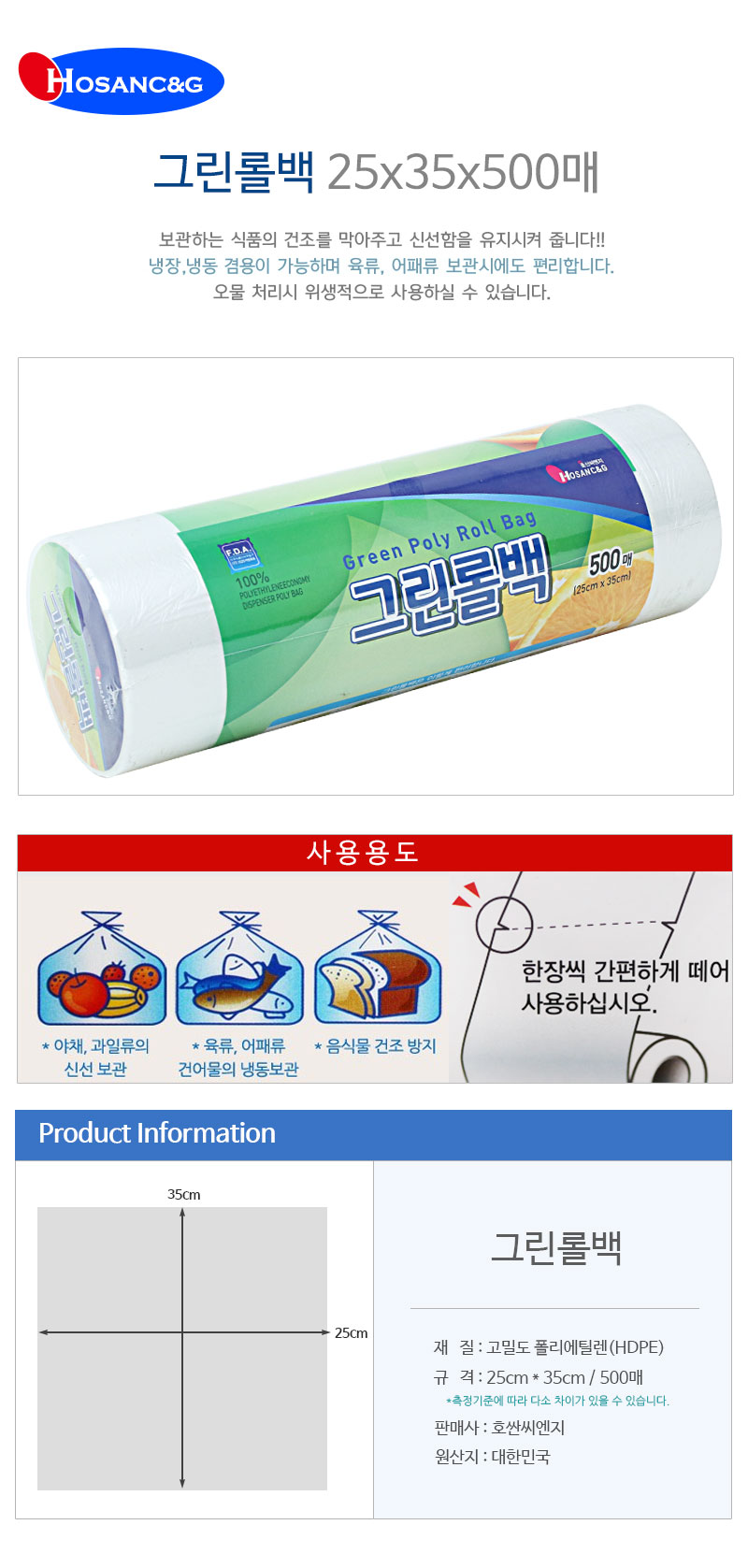 그린 팩 롤 25x35 500매 백 일회용 1P 봉투 봉지 위생 비닐