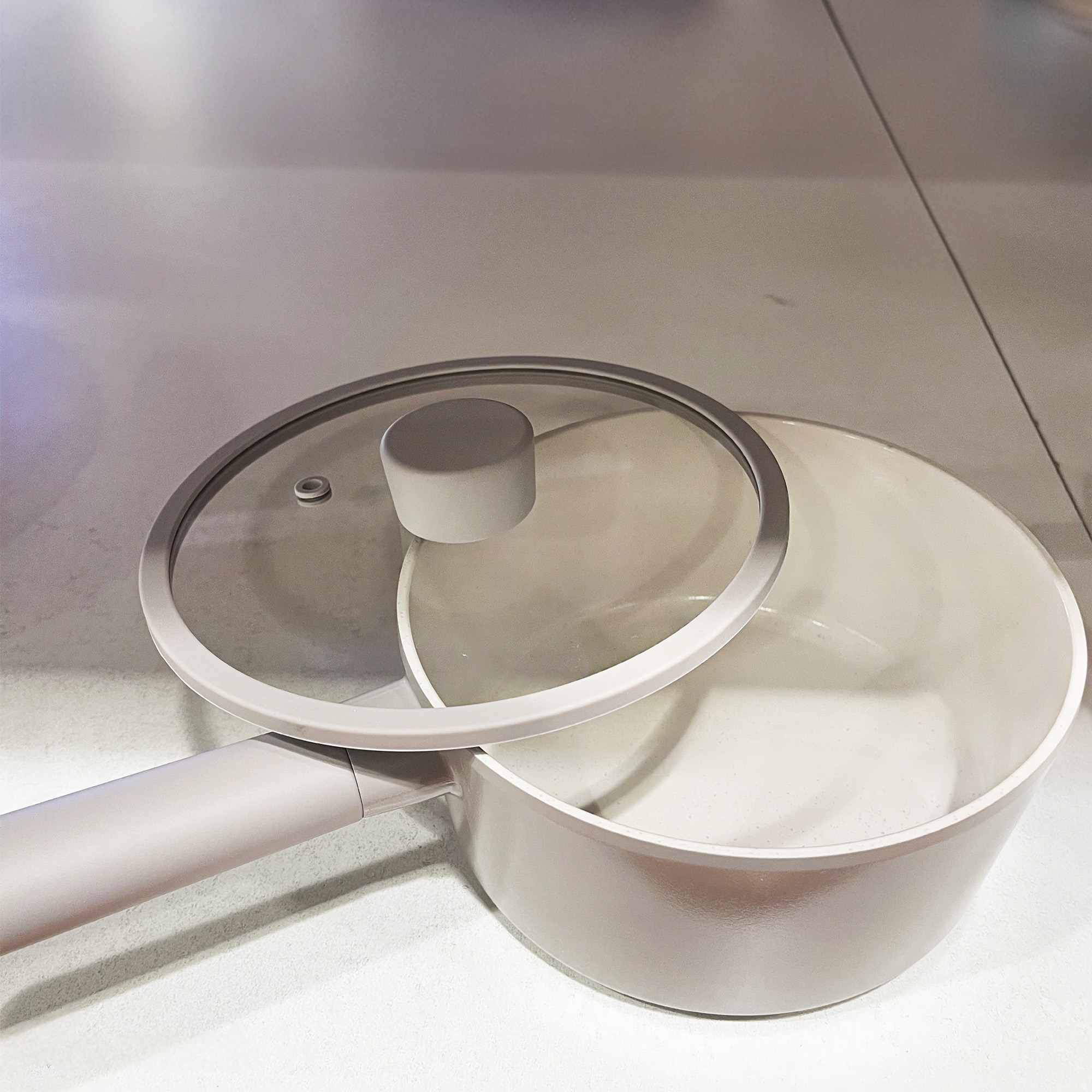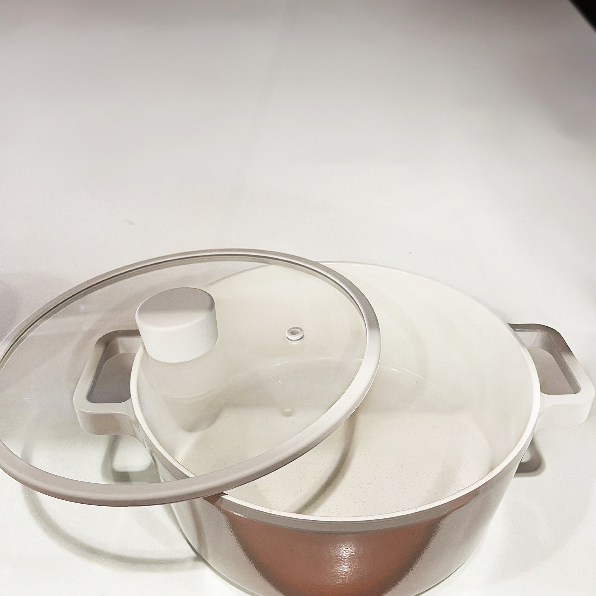 재질: 몸체-알루미늄 (내장 세라믹코팅), 뚜껑-강화유리, 고무제 (실리콘), 노브/손잡이-베이클라이트