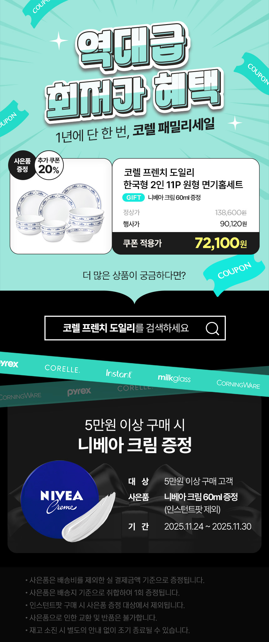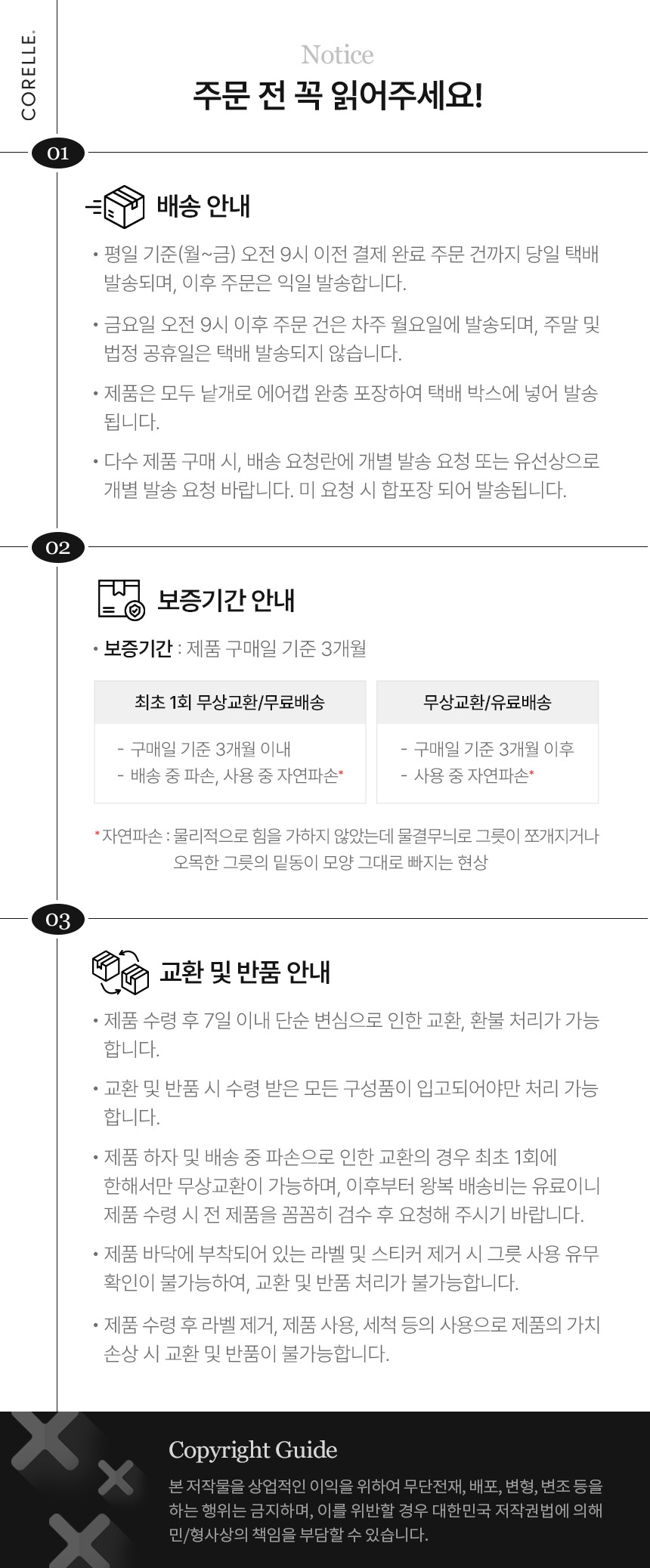 | 제조자/ 수입품의 경우 수입자를 함께 표기 | 제조사: (주)앤크위즈 수입자:코렐브랜드코리아 |