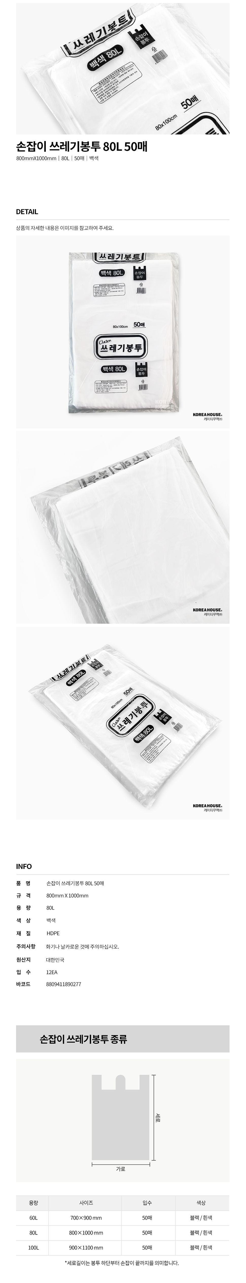 손잡이 쓰레기 봉투 백색 80L 50매 1P 다용도 비닐백 / 쓰레기봉투 비닐봉투 분리수거봉투 재활용봉투