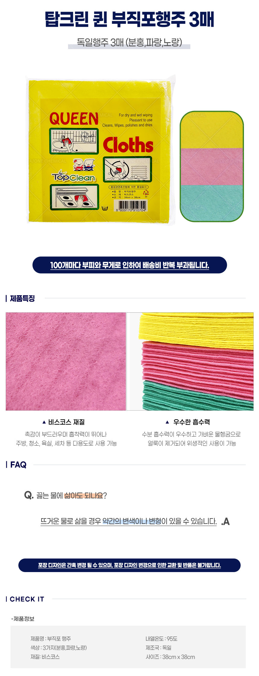 탑크린 부직포 행주 독일 행주 퀸38 3P 3색
