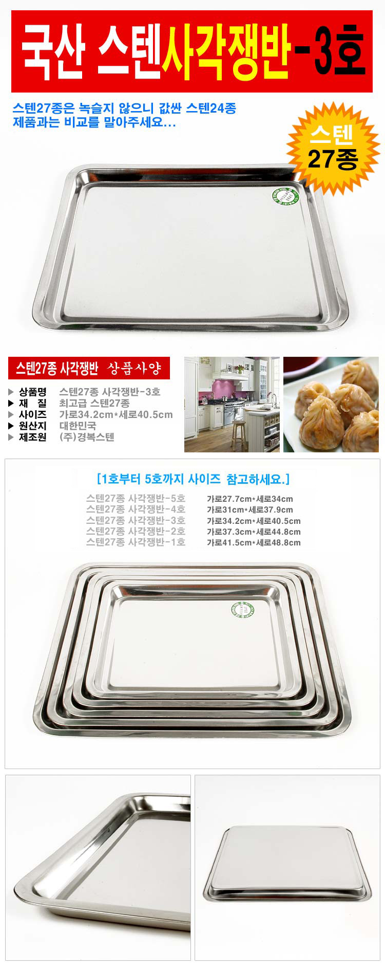 국산 경복스텐 최고급 스텐27종 사각쟁반-3호(대)/지름34.2cm 쟁반 오봉 주방