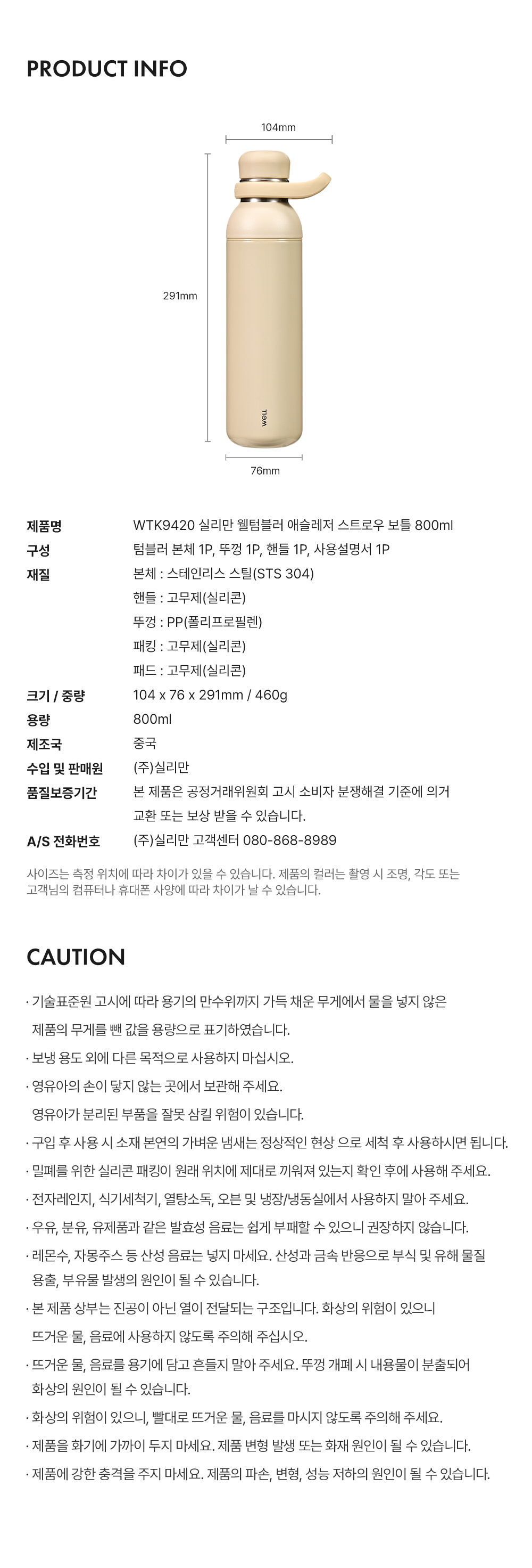 실리만 웰텀블러 애슬레저 스트로우 보틀 800ml 샌디베이지 WTK9420