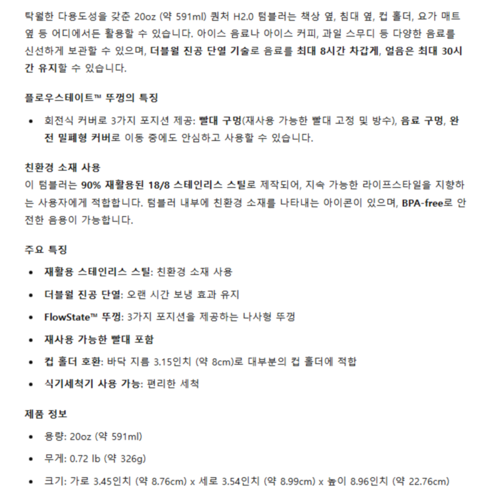스탠리 퀜처 H2.0 플로우 스테이트 텀블러 물병 물통 보틀 20온스(591ml) 미스트