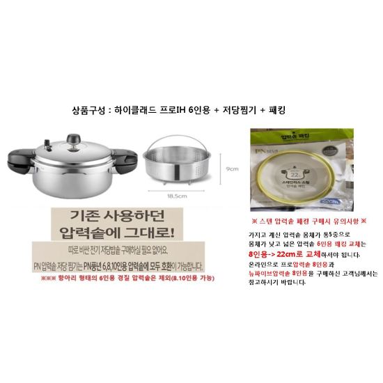 주문하시면 하이클래드 프로IH 압력솥 6인용과 저당찜기와 패킹은 22cm가 출고됩니다.