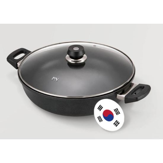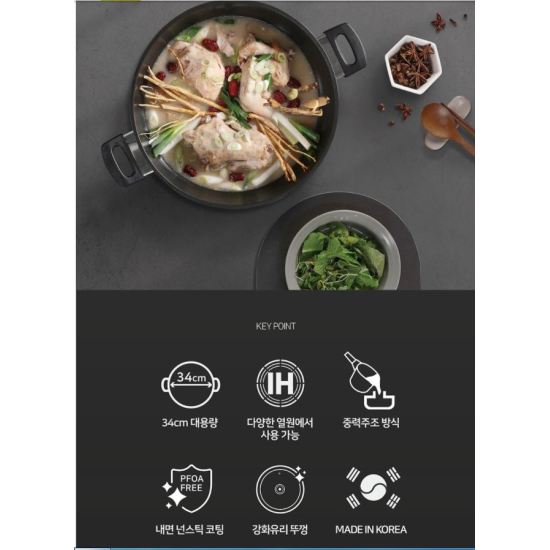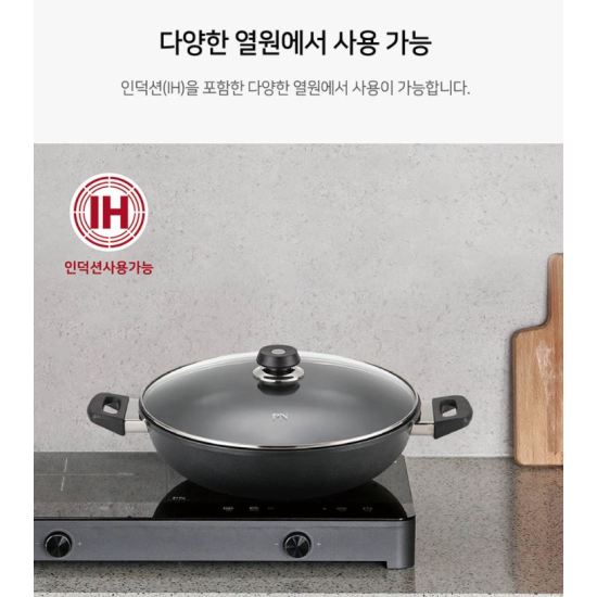 모든 열원에서 가능하며, 넉넉한 크기에 손잡이도 뜨겁지 않고, 유리뚜껑으로 요리가 보이며,