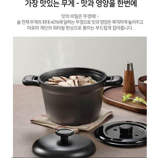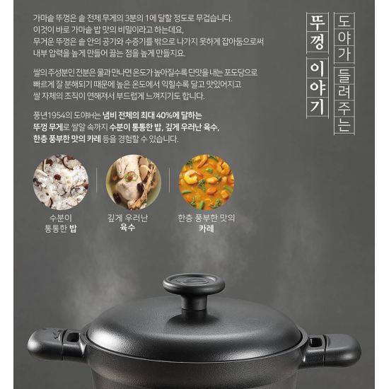 또한 두꺼운 뚜껑으로 음식의 깊은 맛을 구현하면서도 기존 주물의 단점으로 꼽히는 무게 부담을 줄인 점이 특징이다.