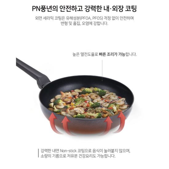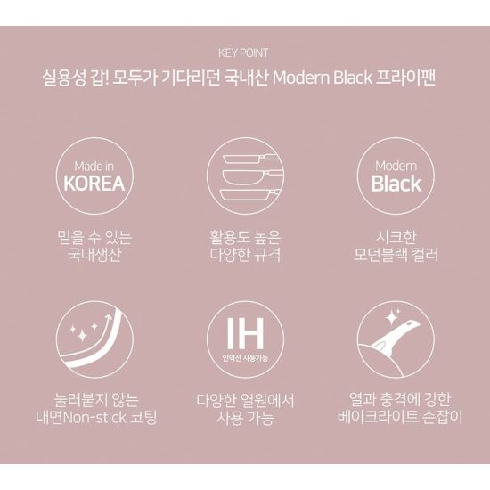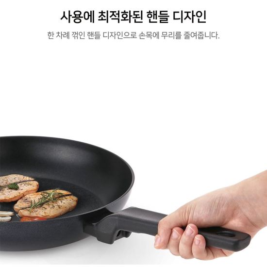 올 블랙으로 데일리 프라이팬으로 사용이 가능하며, 넌스틱 코팅으로 눌어붙음, 소량의 기름 사용이