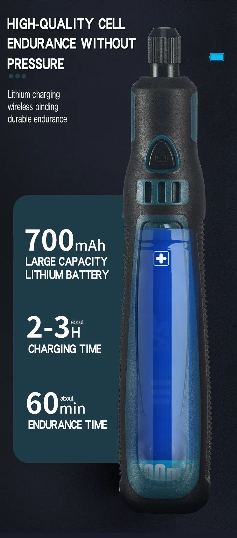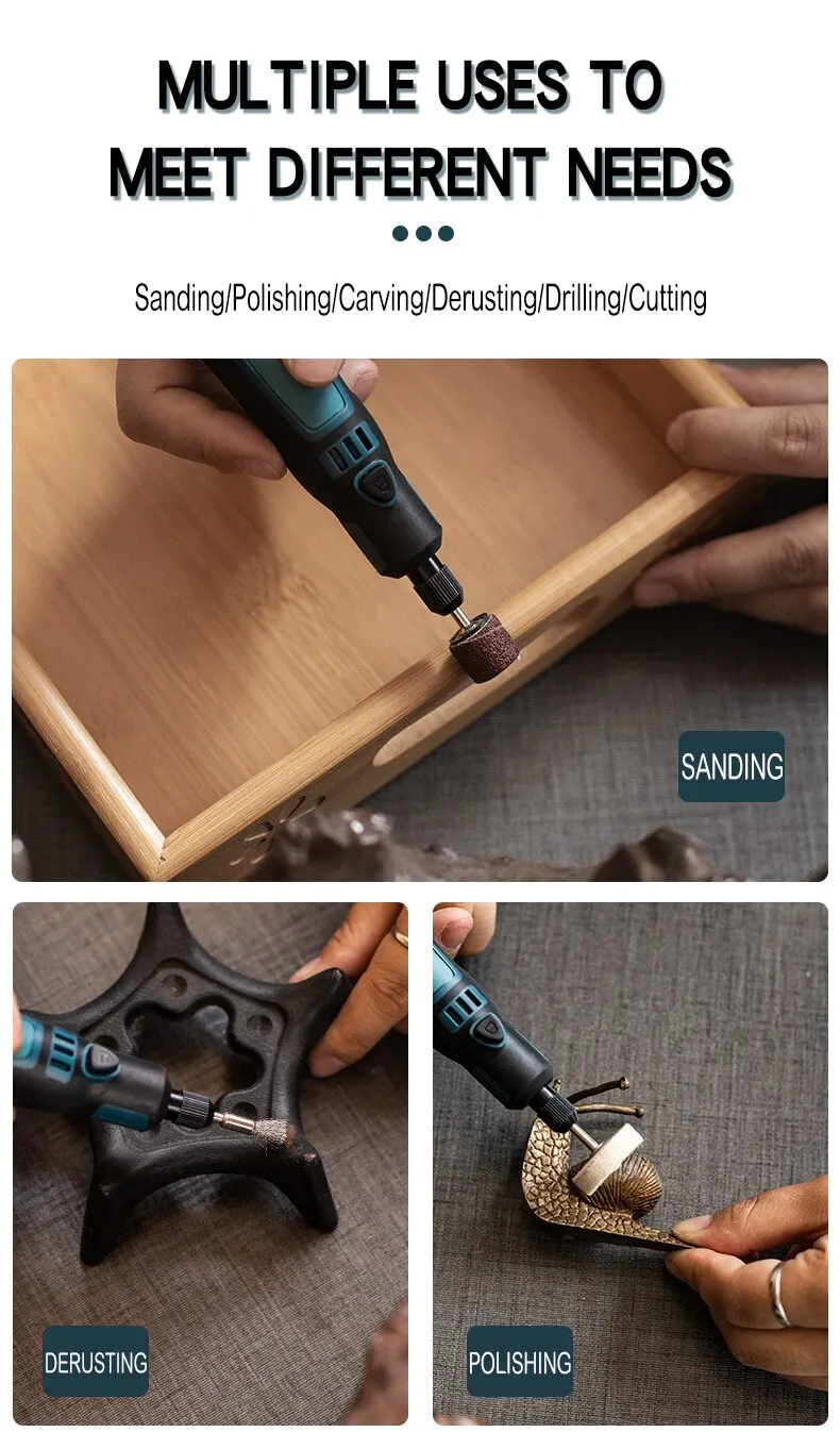 ? 조합:이 전기 그라인더에는 드릴 유형, 배터리 전원 및 가정용 조각 도구 등 다양한 기능이 결합되어 편리한 올인원 공구입니다.
