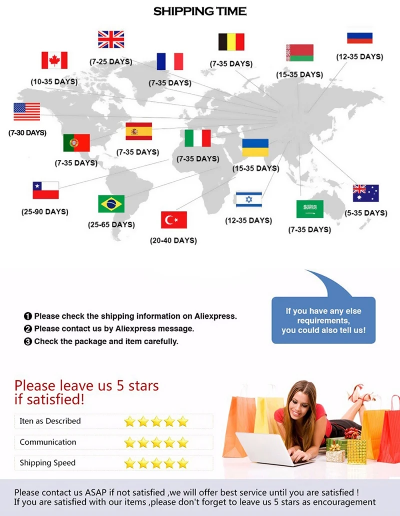6. 예상 배송 날짜는 세관, 날씨 등에 의해 영향을 받을 수 있으며 때로는 수령하는 데 시간이 조금 더 걸릴 수 있습니다. 주문 보호 시간을 연장하려면 패키지를 받지 못한 경우 당사에 문의하십시오.
