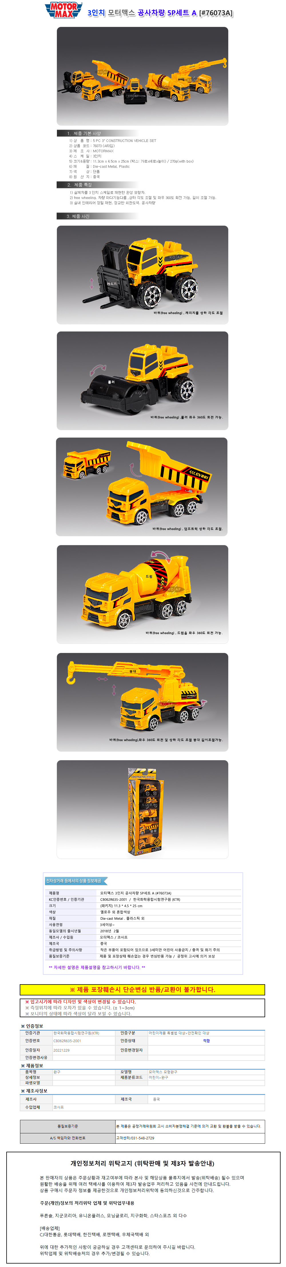 [상품명: 76073A 5P세트A 모터맥스 공사차량 3in 장난감 장난감]